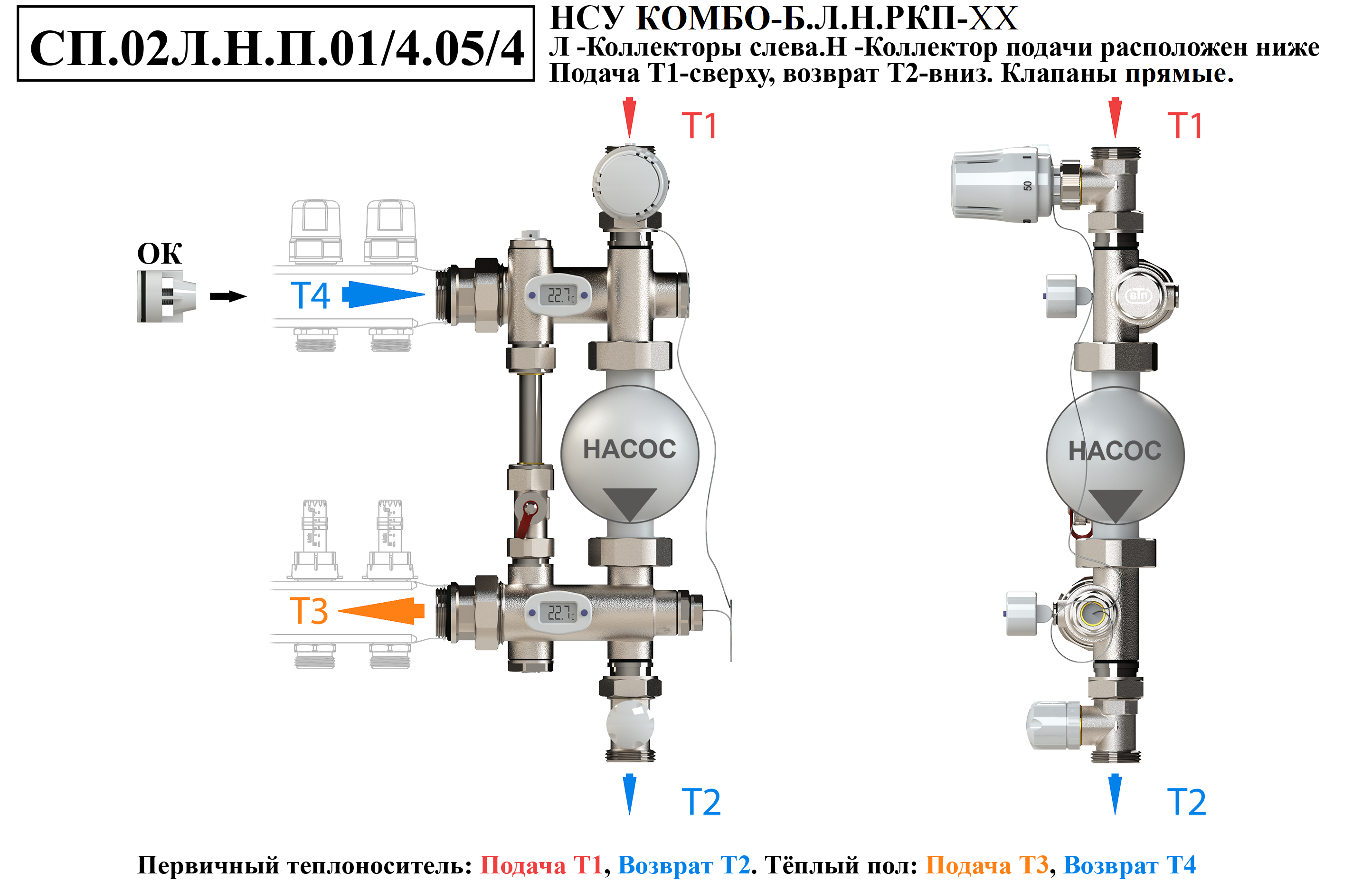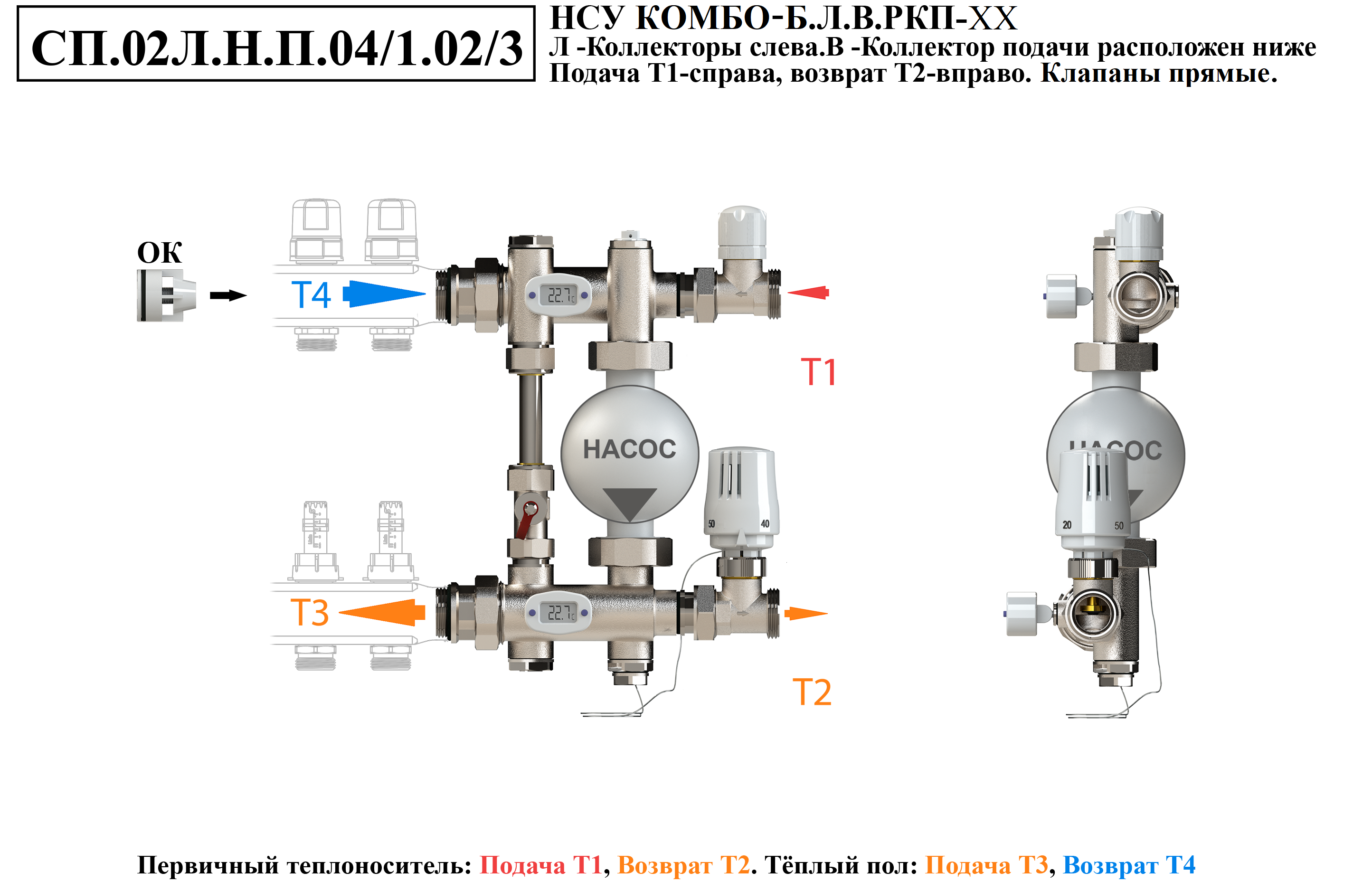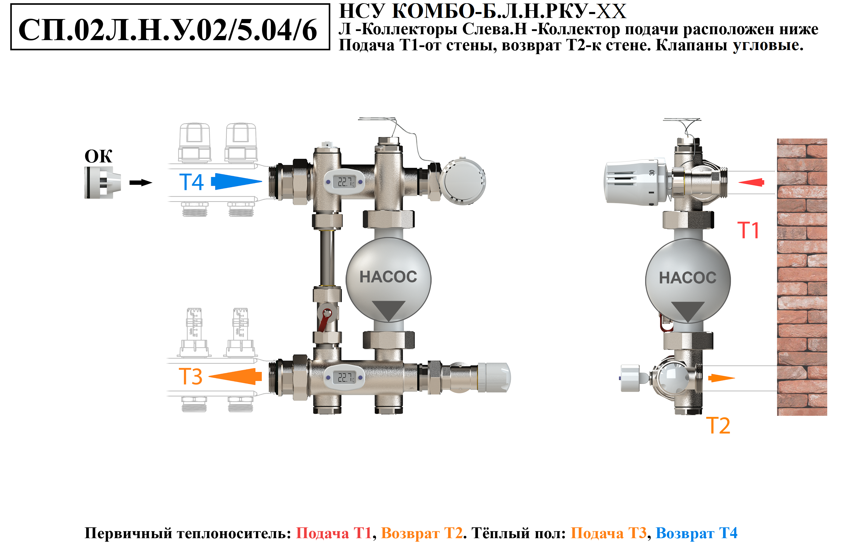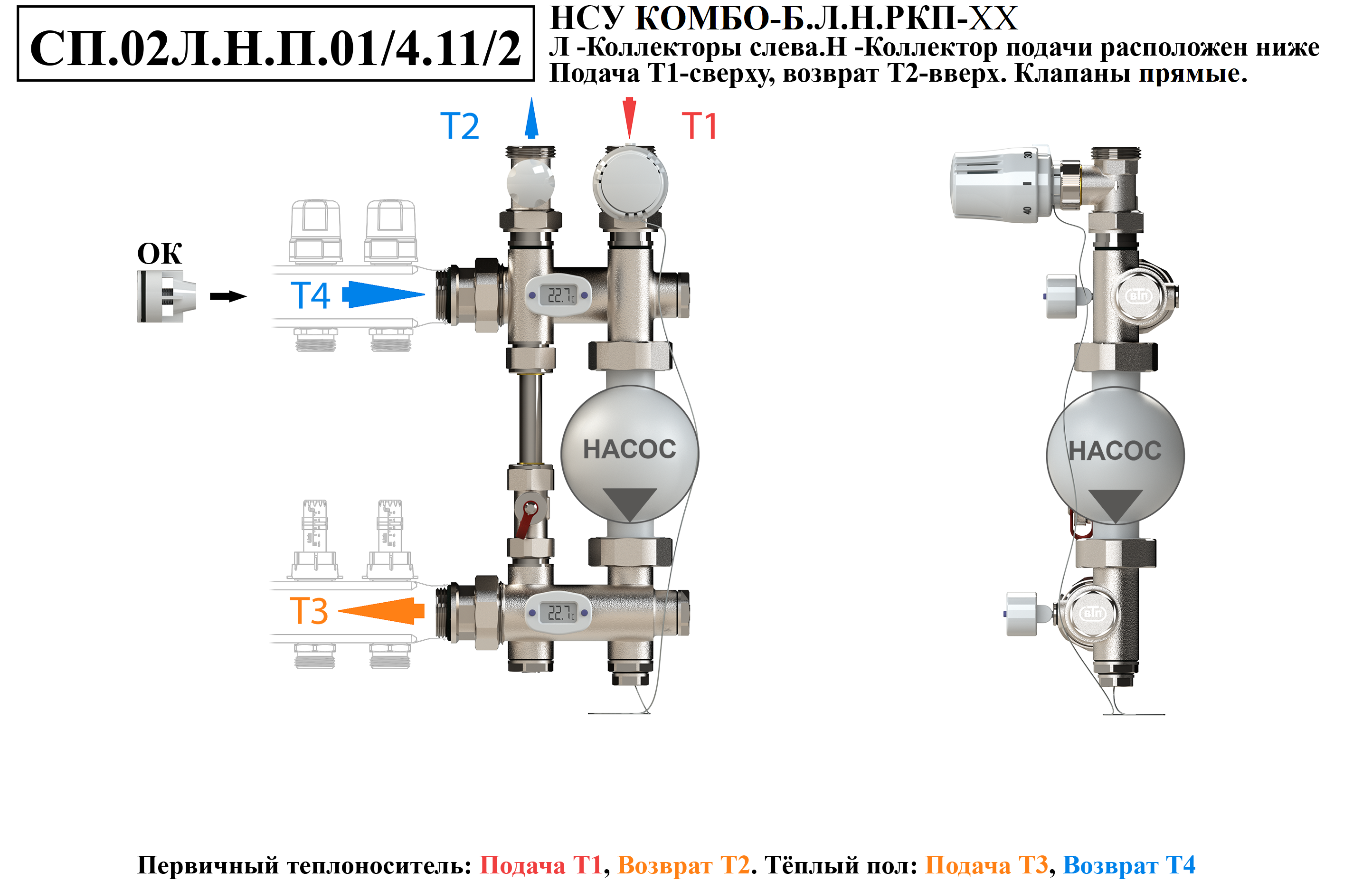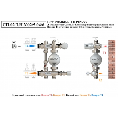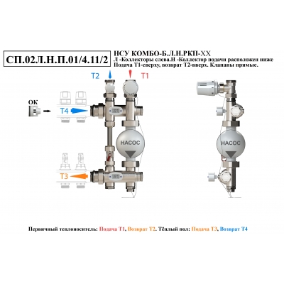 Схемы подключений насосно-смесительного узла КОМБО-Б.Коллекторная группа справа от узла.Подача ниже