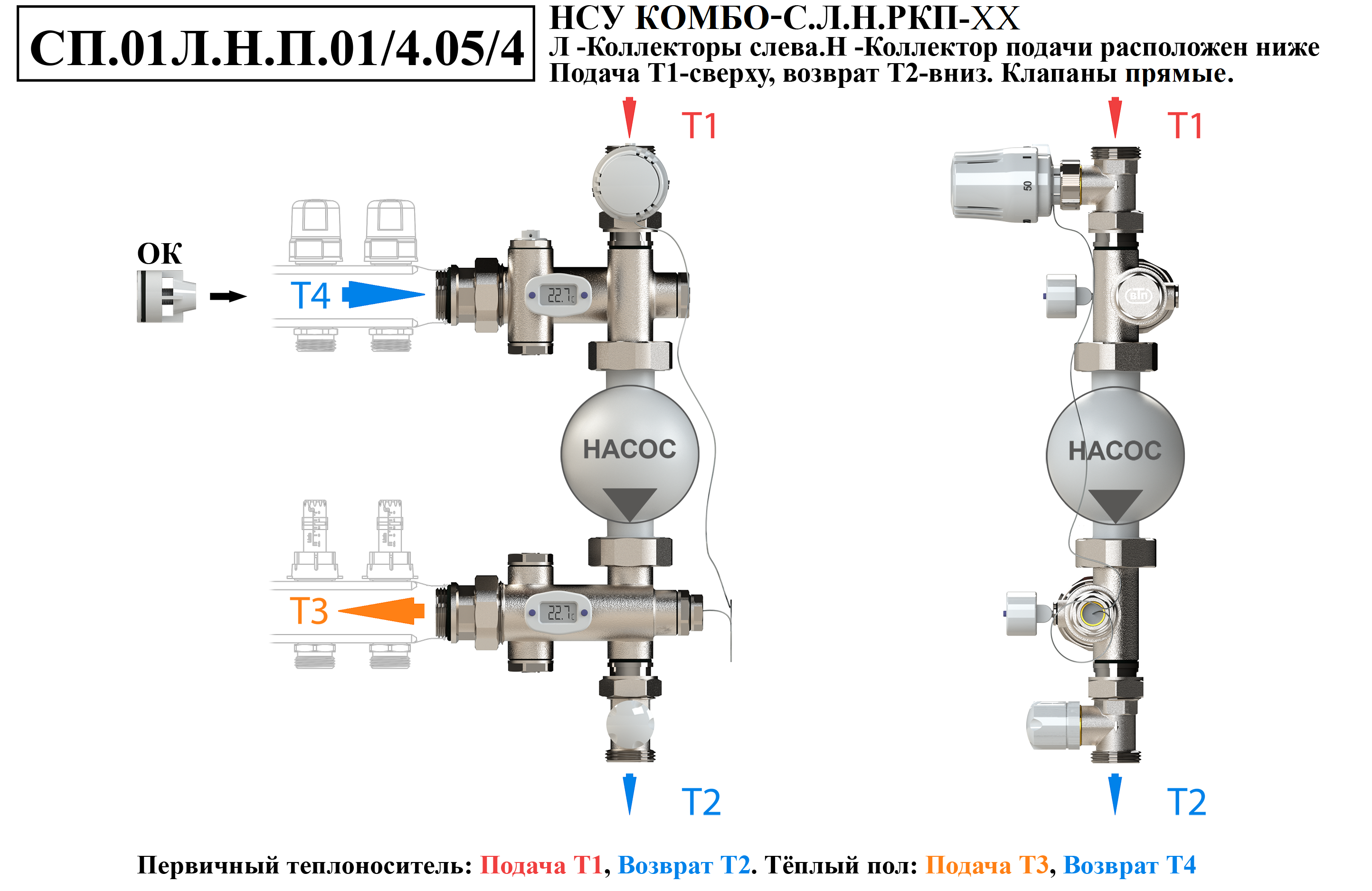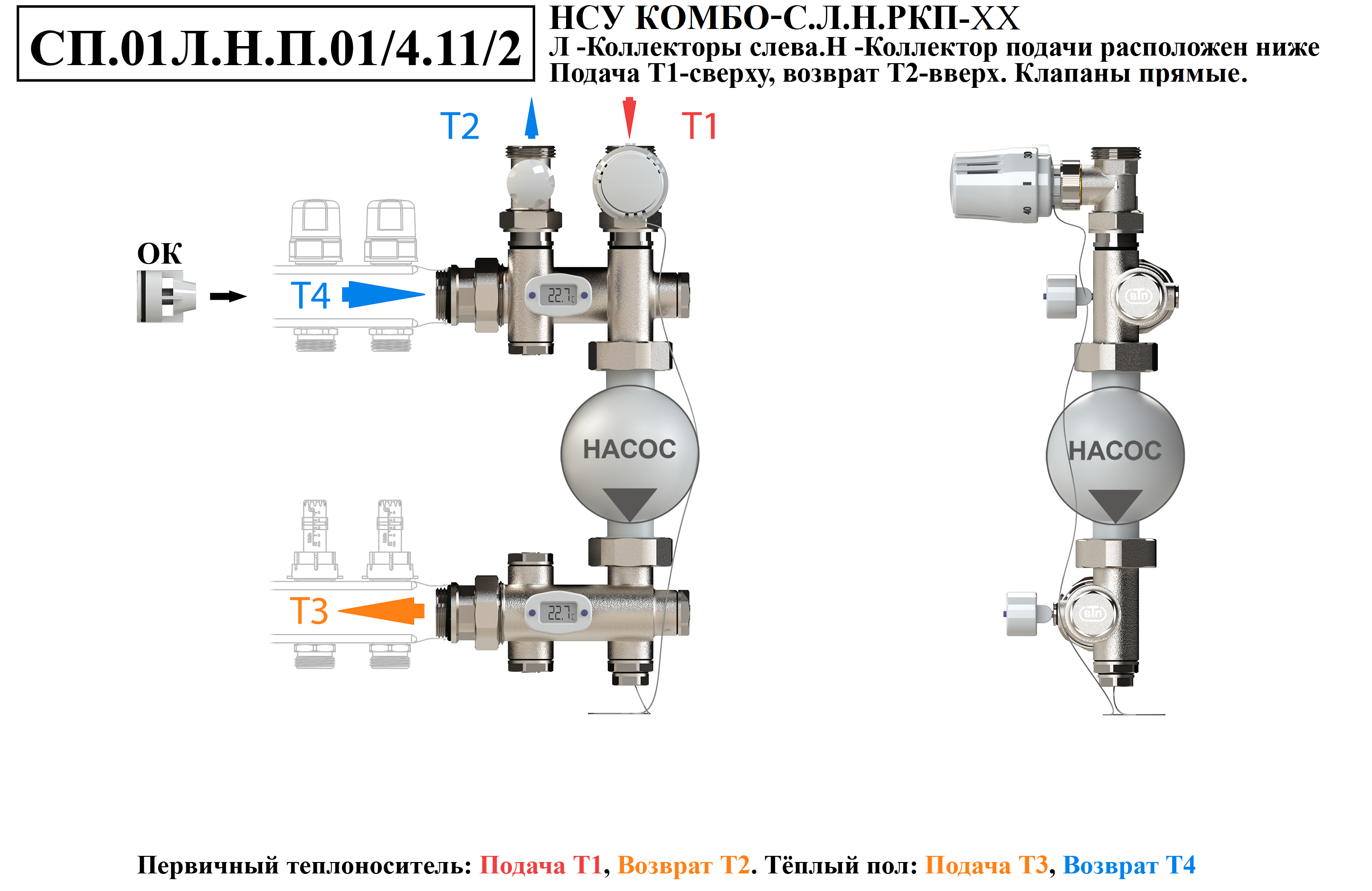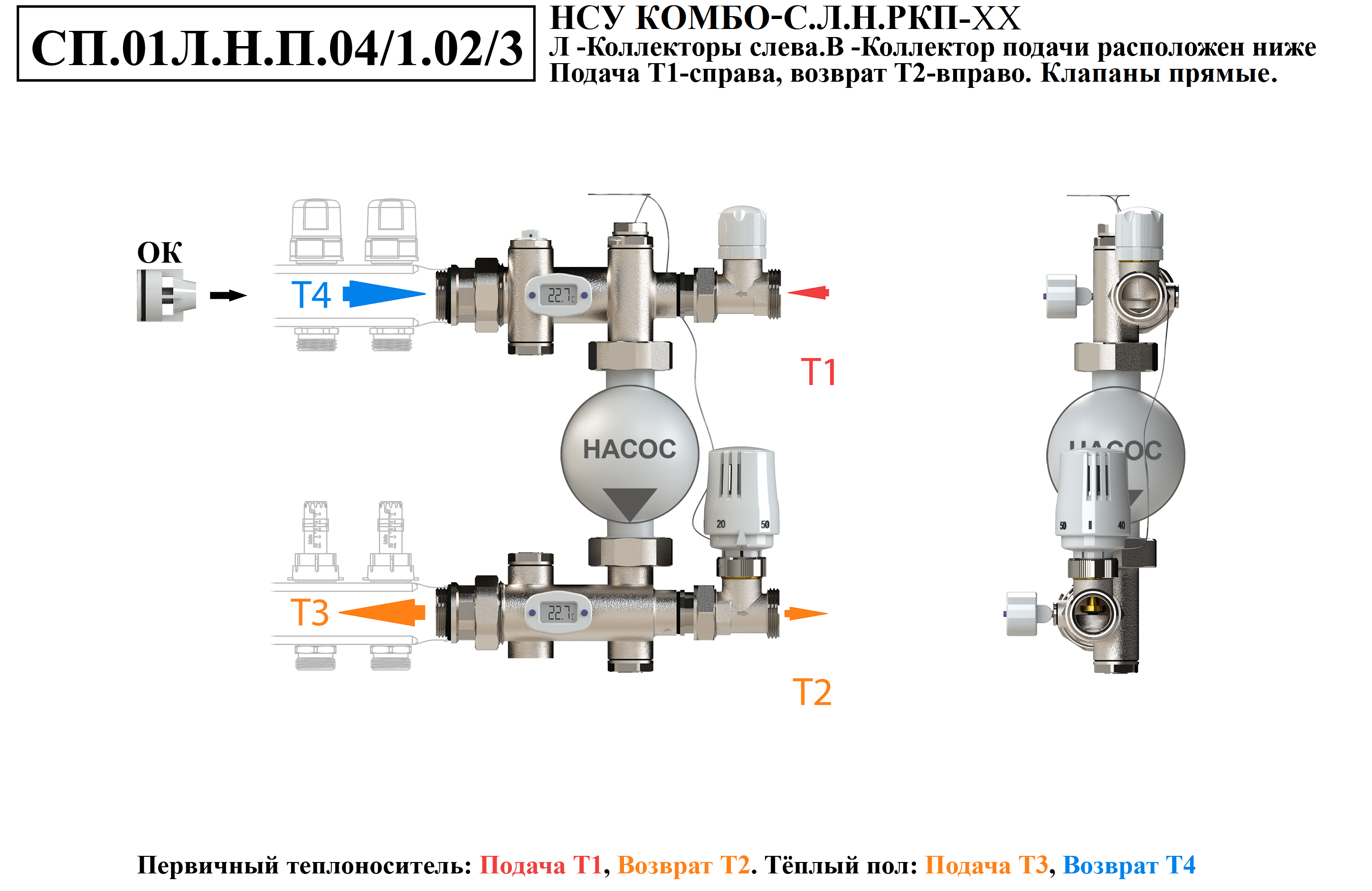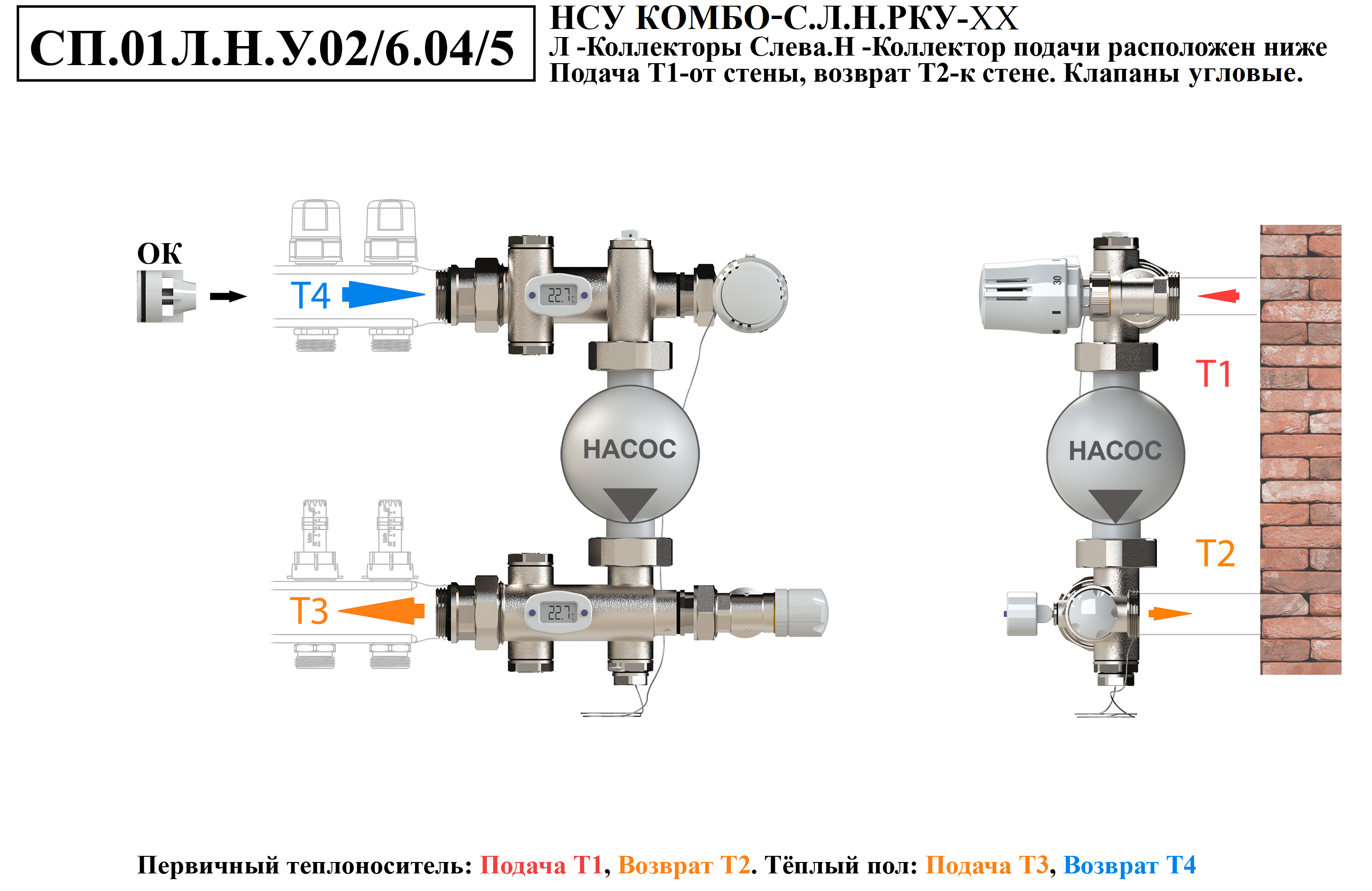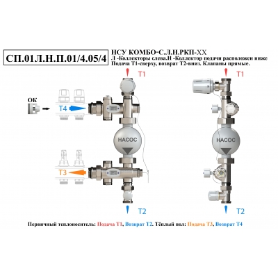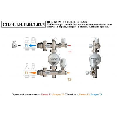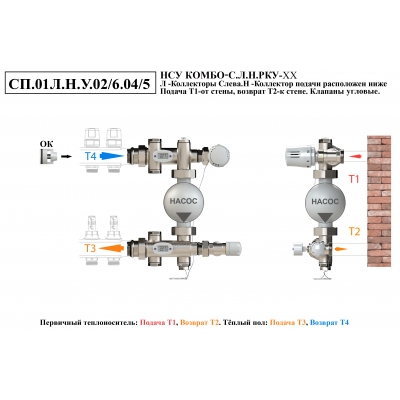 Схемы подключений насосно-смесительного узла КОМБО-С.Коллекторная группа слева от узла.Подача ниже
