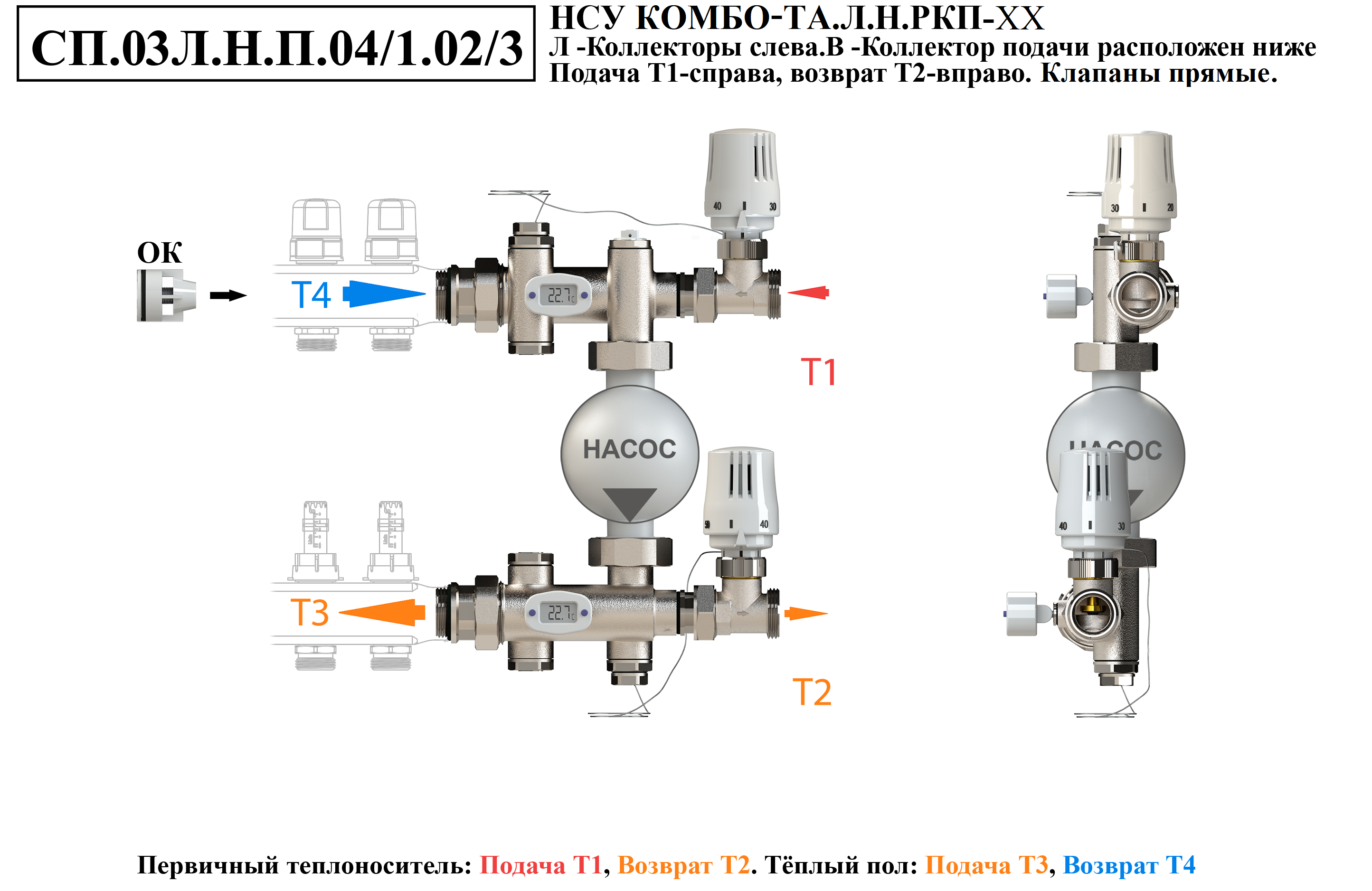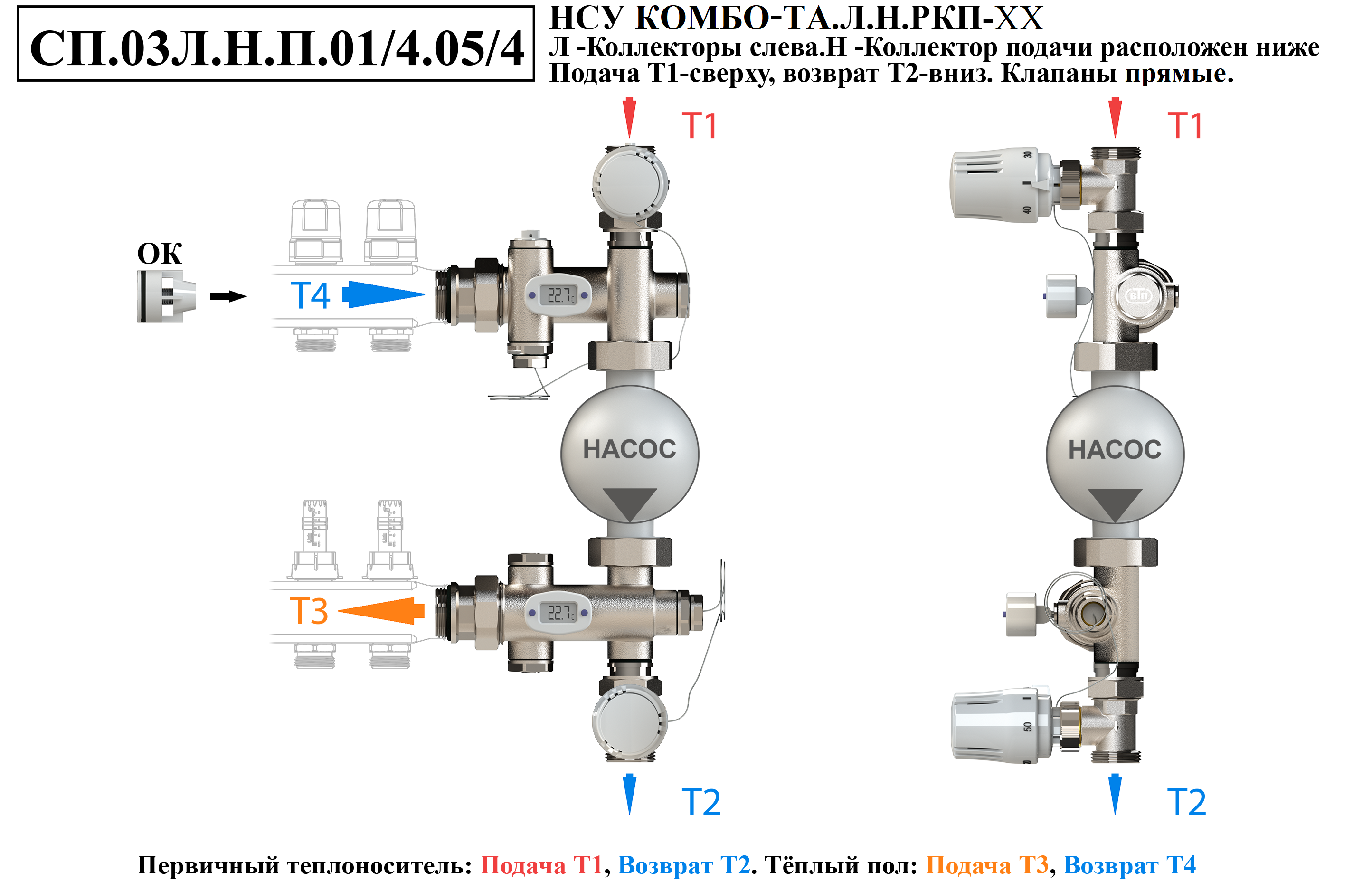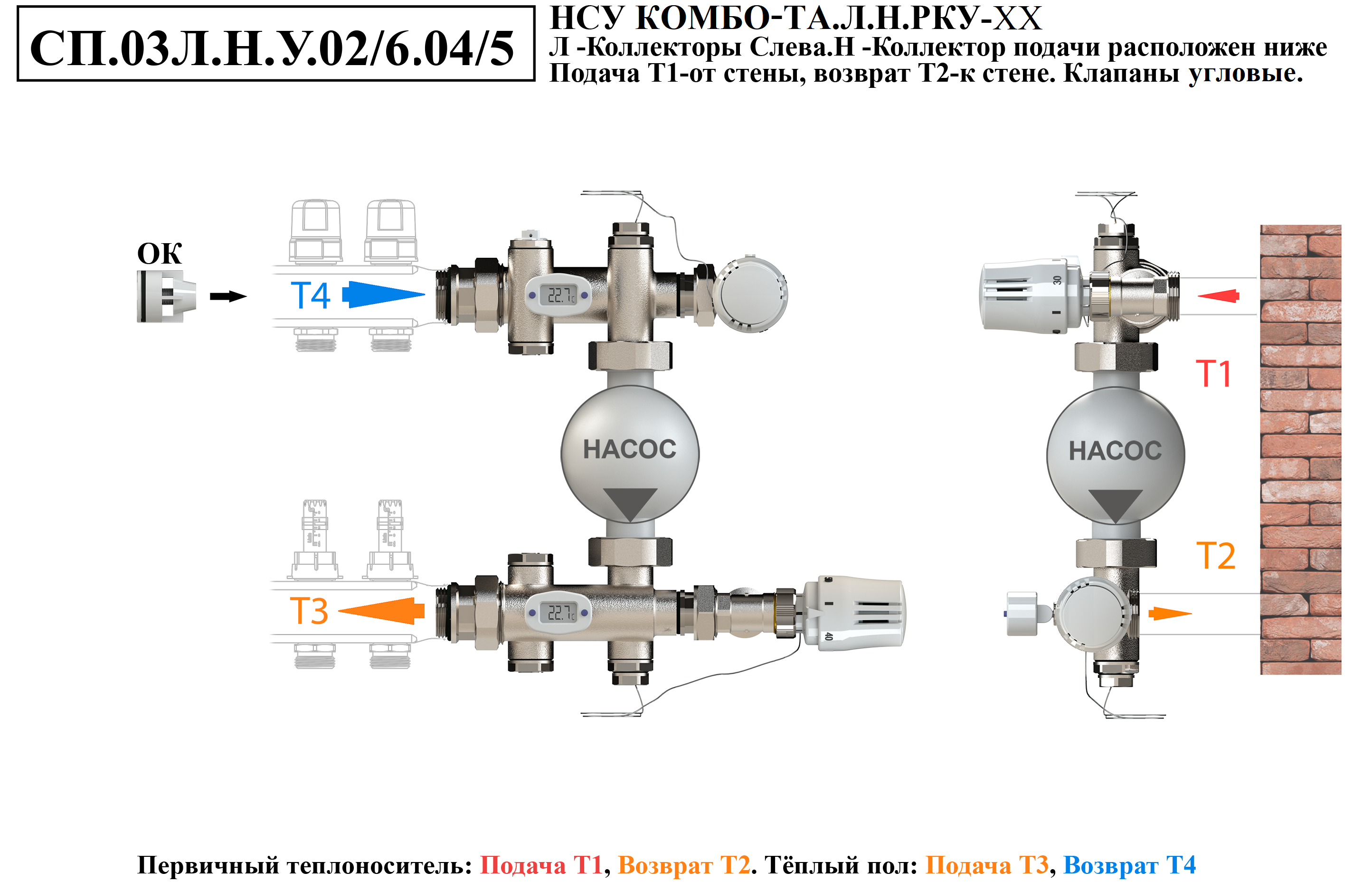Схемы подключений насосно-смесительного узла КОМБО-ТА.Коллекторная группа слева от узла.Подача ниже