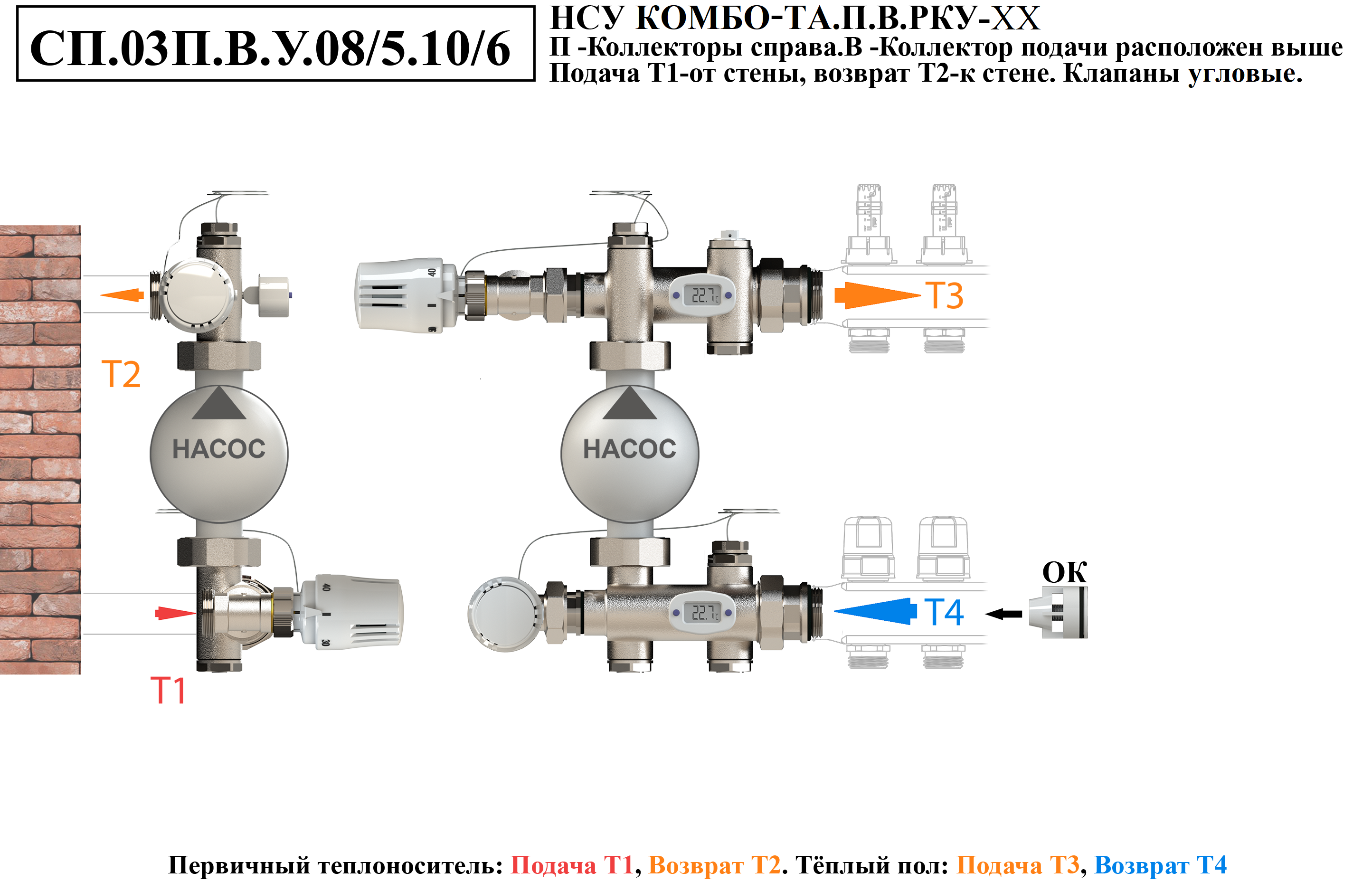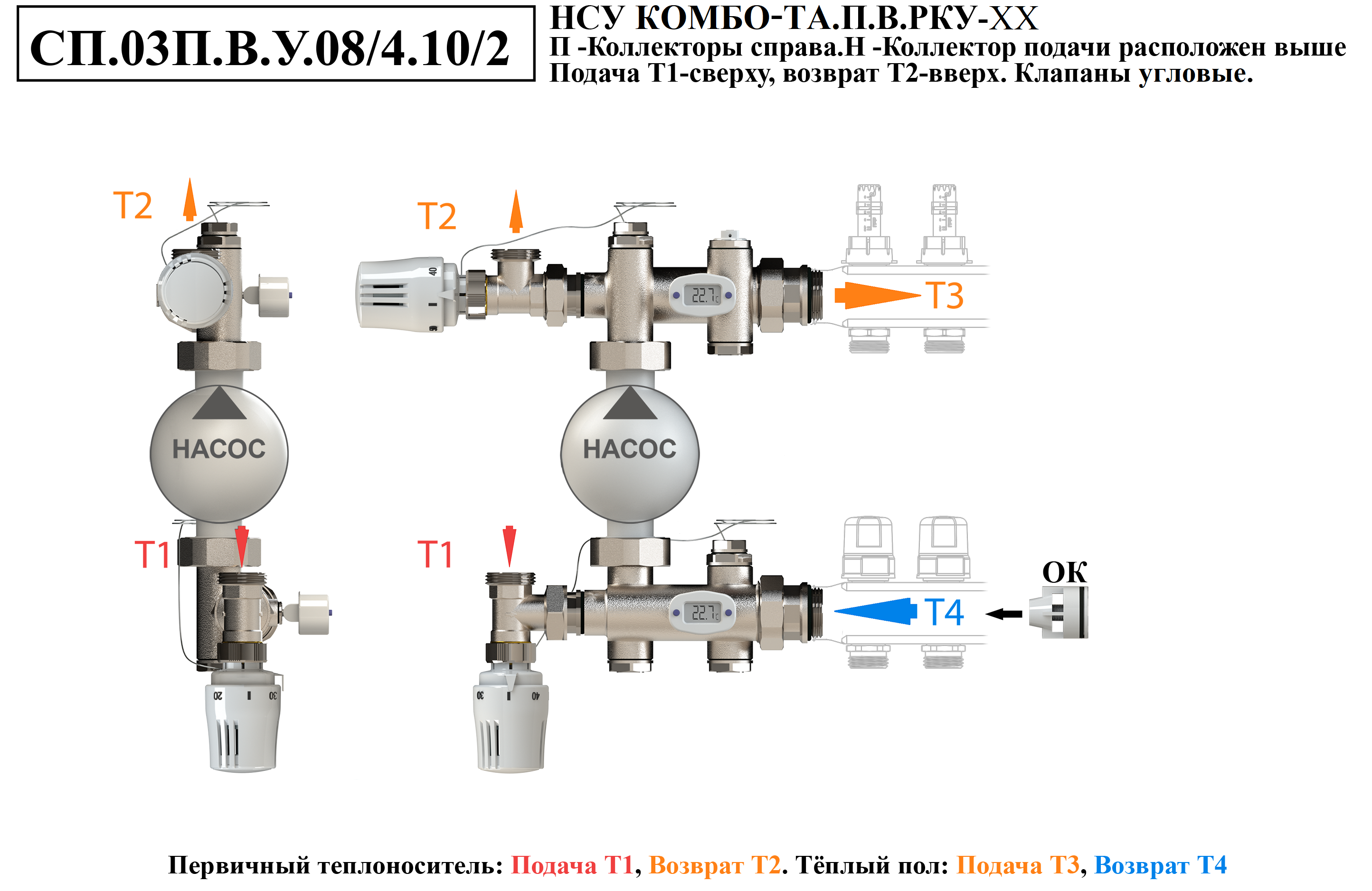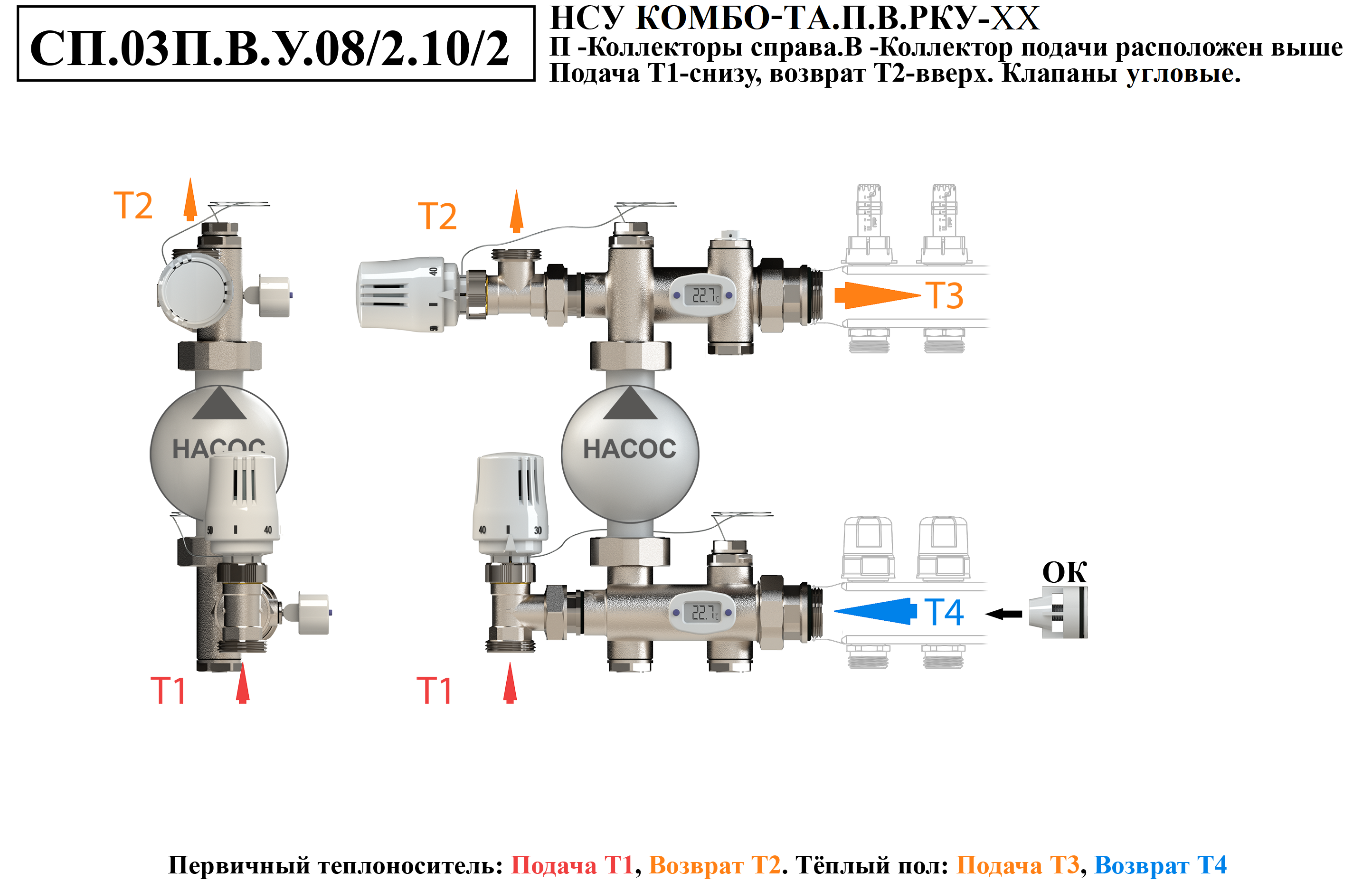 Схемы подключений насосно-смесительного узла КОМБО-ТА.Коллекторная группа справа от узла.Подача выше