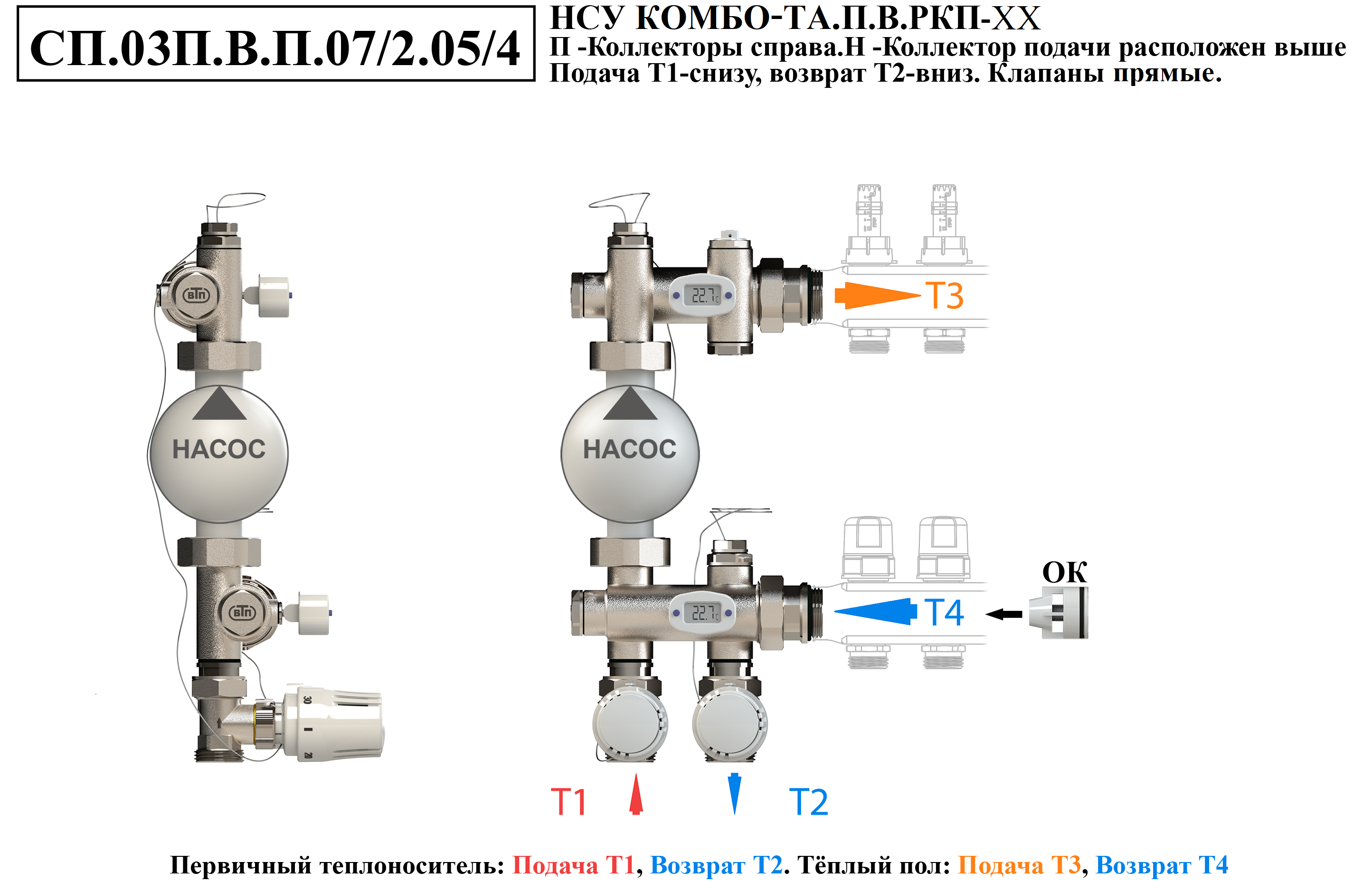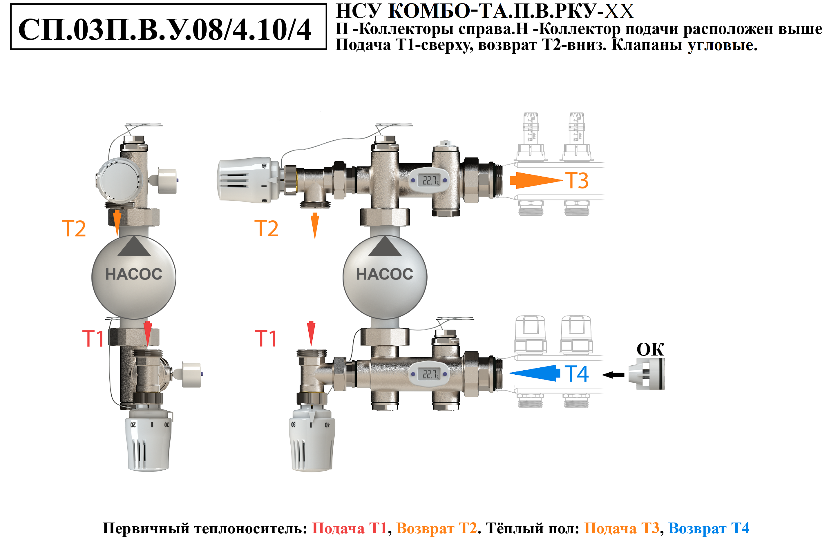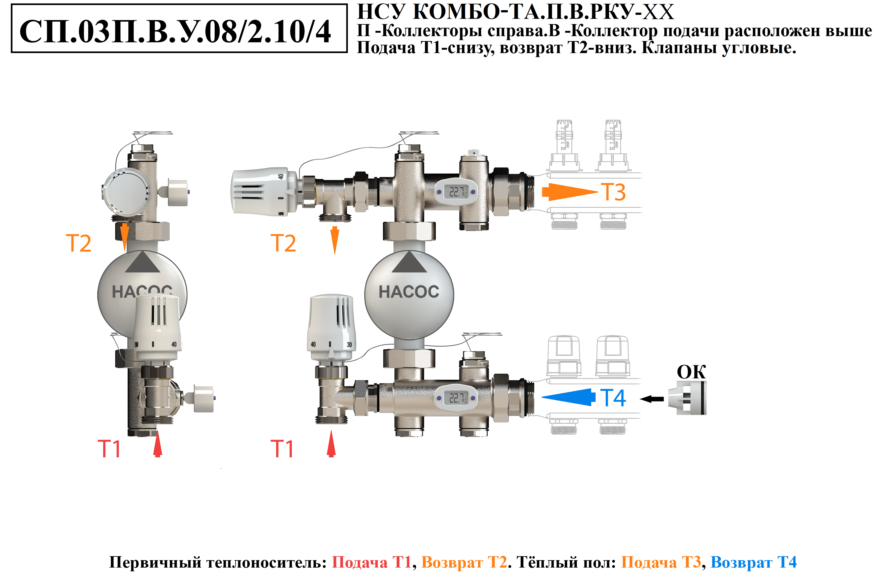 Схемы подключений насосно-смесительного узла КОМБО-ТА.Коллекторная группа справа от узла.Подача выше