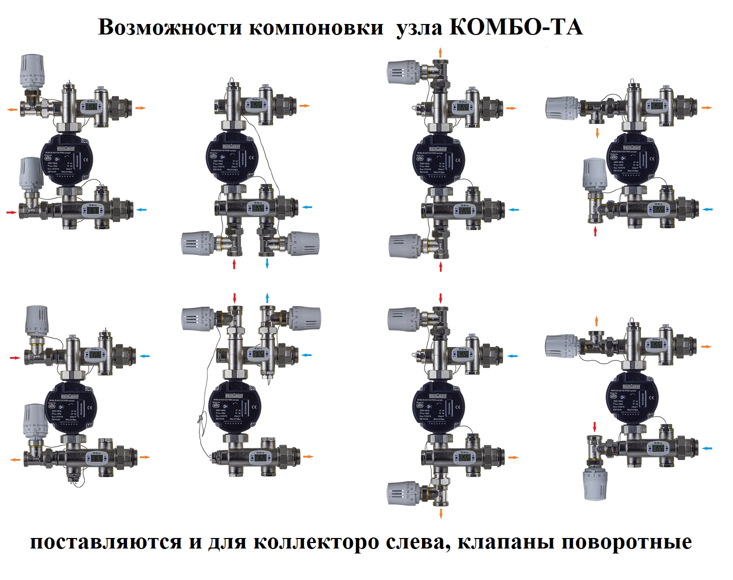 Причём НСУ серии КОМБО, благодаря использованию двух регулирующих клапанов, обеспечивает огромное количество вариантов подключения к теплоснабжающей магистрали. Подключение коллекторных групп с левой и правой стороны от НСУ.