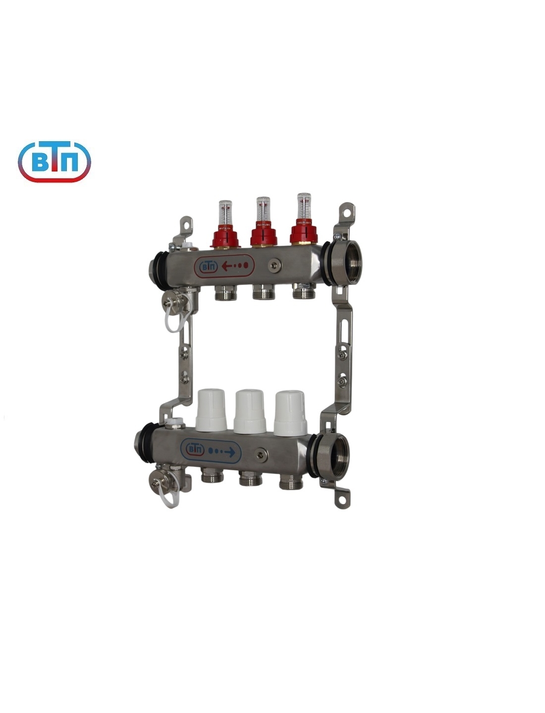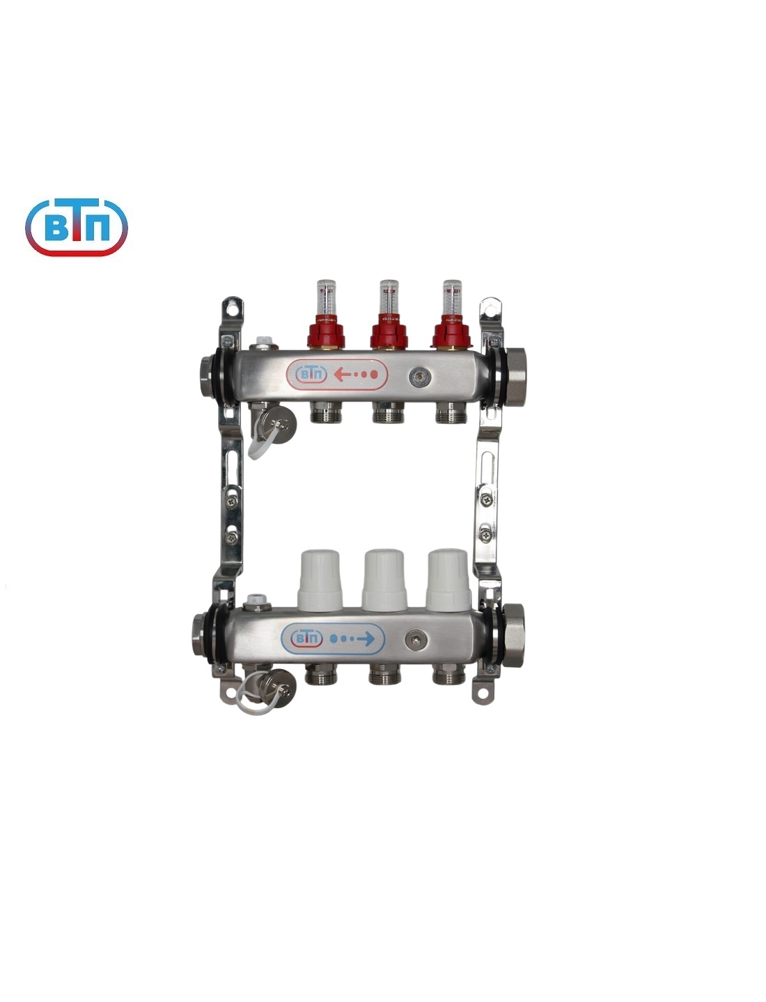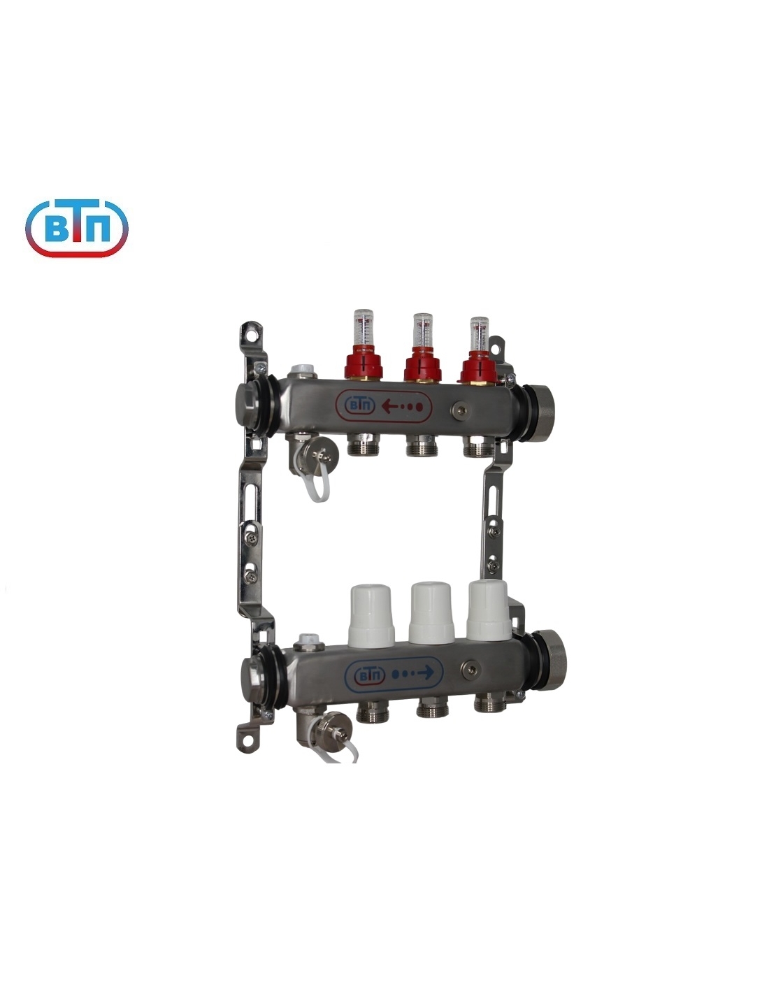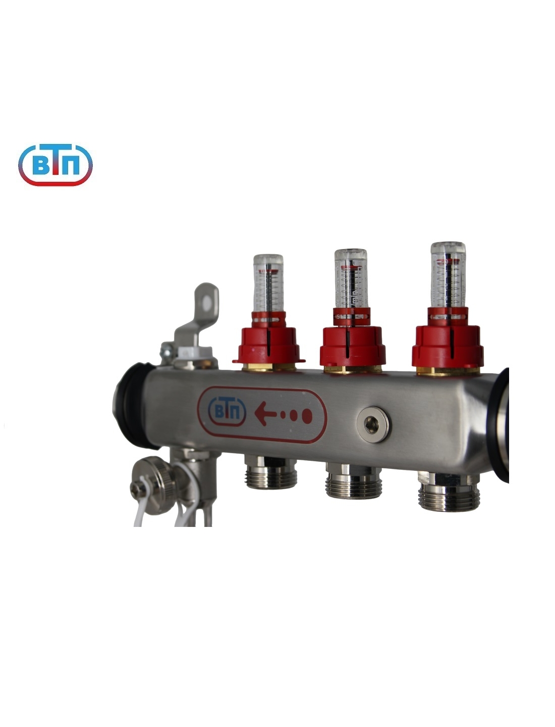 Из нержавеющей стали. Расходомеры "Taconova" (Швеция), регулирующие вентили. С обоих торцов внутренняя резьба 1", с одной стороны заглушки 1", надежные ручные воздухоспускники, поворотные дренажные вентили (никелированная латунь). Раздвижные кронштейны. Предназначена для подключения 3 контуров. С правой стороны коллекторов резьбовые отверстия 1" с накидной гайкой , с левой стороны заглушки 1". Выход каждого контура снабжён регулирующим вентилем с резьбовым монтажным элементом, предназначенным для установки сервопривода или термоголовки с резьбой М30х1,5. На лицевой стороне коллекторов имеются дополнительные сервисные отверстия 1/4" закрытые заглушкой. Ручные клапаны отвода воздуха исключают опасность самопроизвольного вытекания теплоносителя. Выход дренажного вентили поворачивается на 360 градусов, совместим соединителями «Евроконус». Обладает плавным открытием. Для присоединения трубопроводов выводы коллекторов выполнены с геометрией для подключения соединителей стандарта «Евроконус».