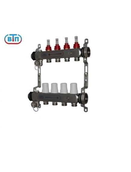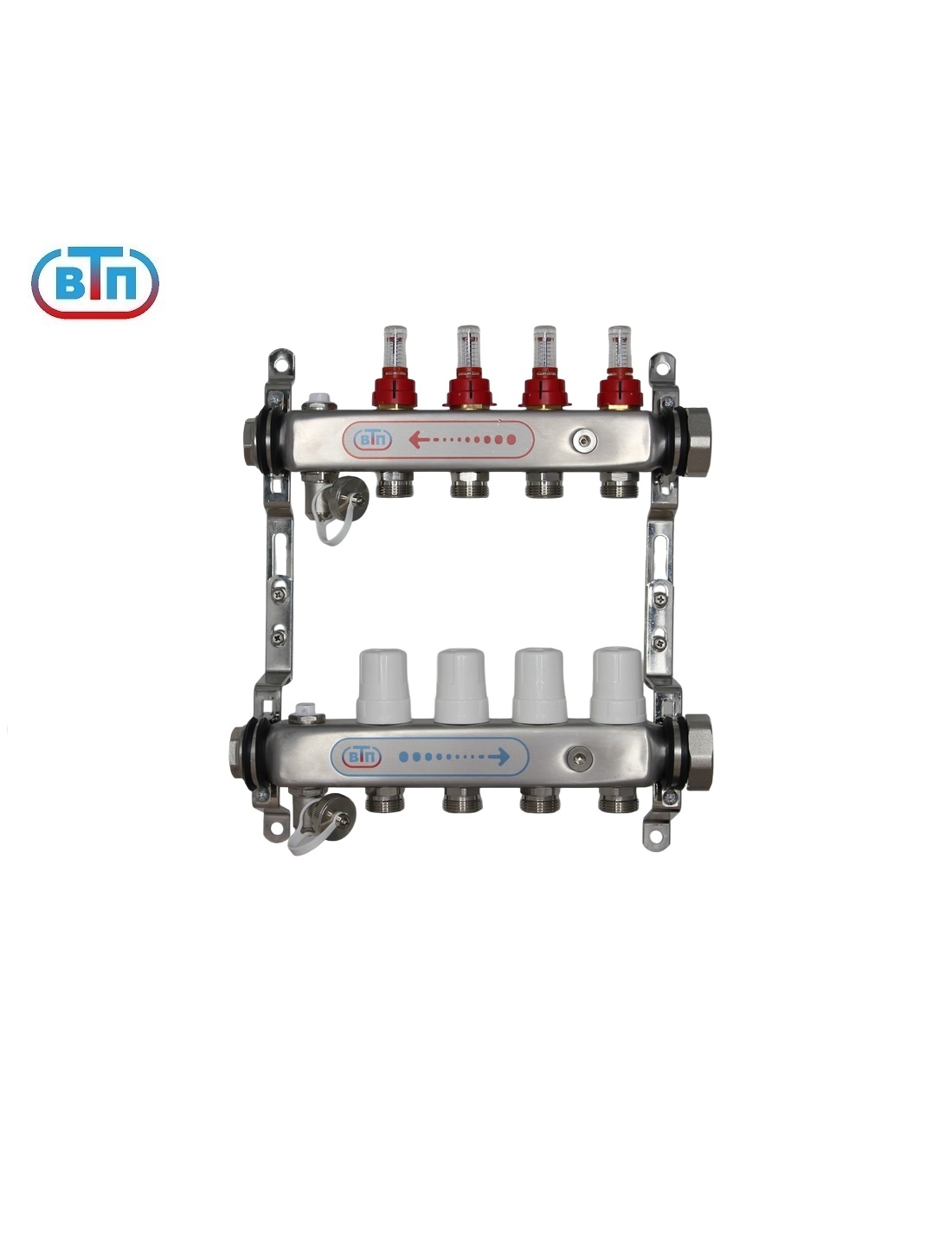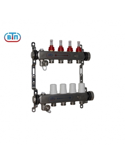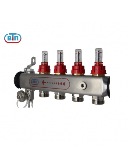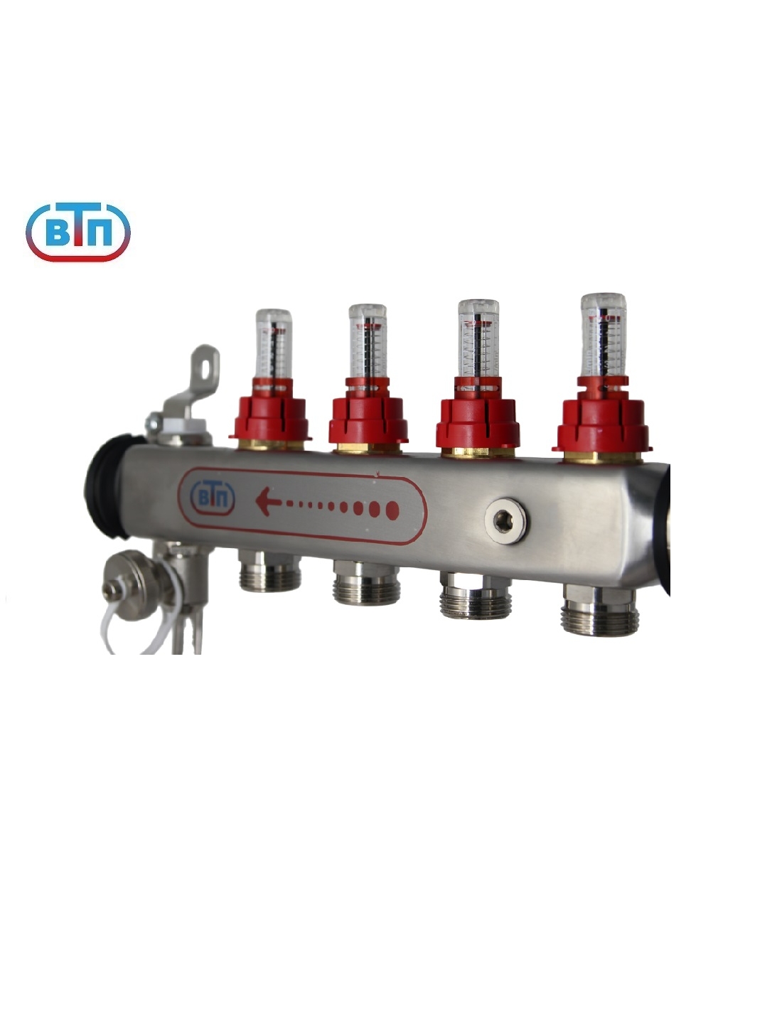 Из нержавеющей стали. Расходомеры "Taconova" (Швеция), регулирующие вентили. С обоих торцов внутренняя резьба 1", с одной стороны заглушки 1", надежные ручные воздухоспускники, поворотные дренажные вентили (никелированная латунь). Раздвижные кронштейны. Предназначена для подключения 4 контуров. С правой стороны коллекторов резьбовые отверстия 1" с накидной гайкой , с левой стороны заглушки 1". Выход каждого контура снабжён регулирующим вентилем с резьбовым монтажным элементом, предназначенным для установки сервопривода или термоголовки с резьбой М30х1,5. На лицевой стороне коллекторов имеются дополнительные сервисные отверстия 1/4" закрытые заглушкой. Ручные клапаны отвода воздуха исключают опасность самопроизвольного вытекания теплоносителя. Выход дренажного вентили поворачивается на 360 градусов, совместим соединителями «Евроконус». Обладает плавным открытием. Для присоединения трубопроводов выводы коллекторов выполнены с геометрией для подключения соединителей стандарта «Евроконус».