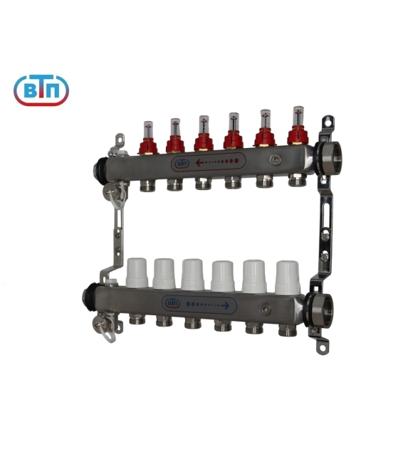 Из нержавеющей стали. Расходомеры "Taconova" (Швеция). Сервисное отверстие закрыто заглушкой 1/4" . С левой стороны заглушки 1", надежные ручные воздухоспускники, поворотные дренажные клапаны (никелированная латунь). Раздвижные кронштейны. Выход каждого контура снабжён регулирующим вентилем с резьбовым монтажным элементом, предназначенным для установки сервопривода или термоголовки с резьбой М30х1,5. Для присоединения трубопроводов выводы коллекторов выполнены с геометрией для подключения соединителей стандарта «Евроконус».