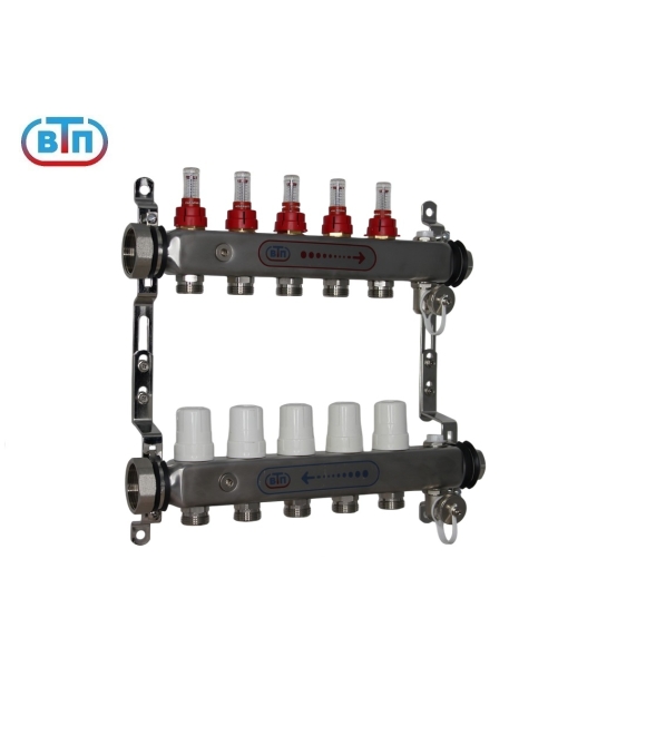Из нержавеющей стали. Расходомеры "Taconova" (Швеция). Сервисное отверстие закрыто заглушкой 1/4" . С правой стороны заглушки 1", надежные ручные воздухоспускники, поворотные дренажные клапаны (никелированная латунь). Раздвижные кронштейны. Выход каждого контура снабжён регулирующим вентилем с резьбовым монтажным элементом, предназначенным для установки сервопривода или термоголовки с резьбой М30х1,5. Для присоединения трубопроводов выводы коллекторов выполнены с геометрией для подключения соединителей стандарта «Евроконус».
