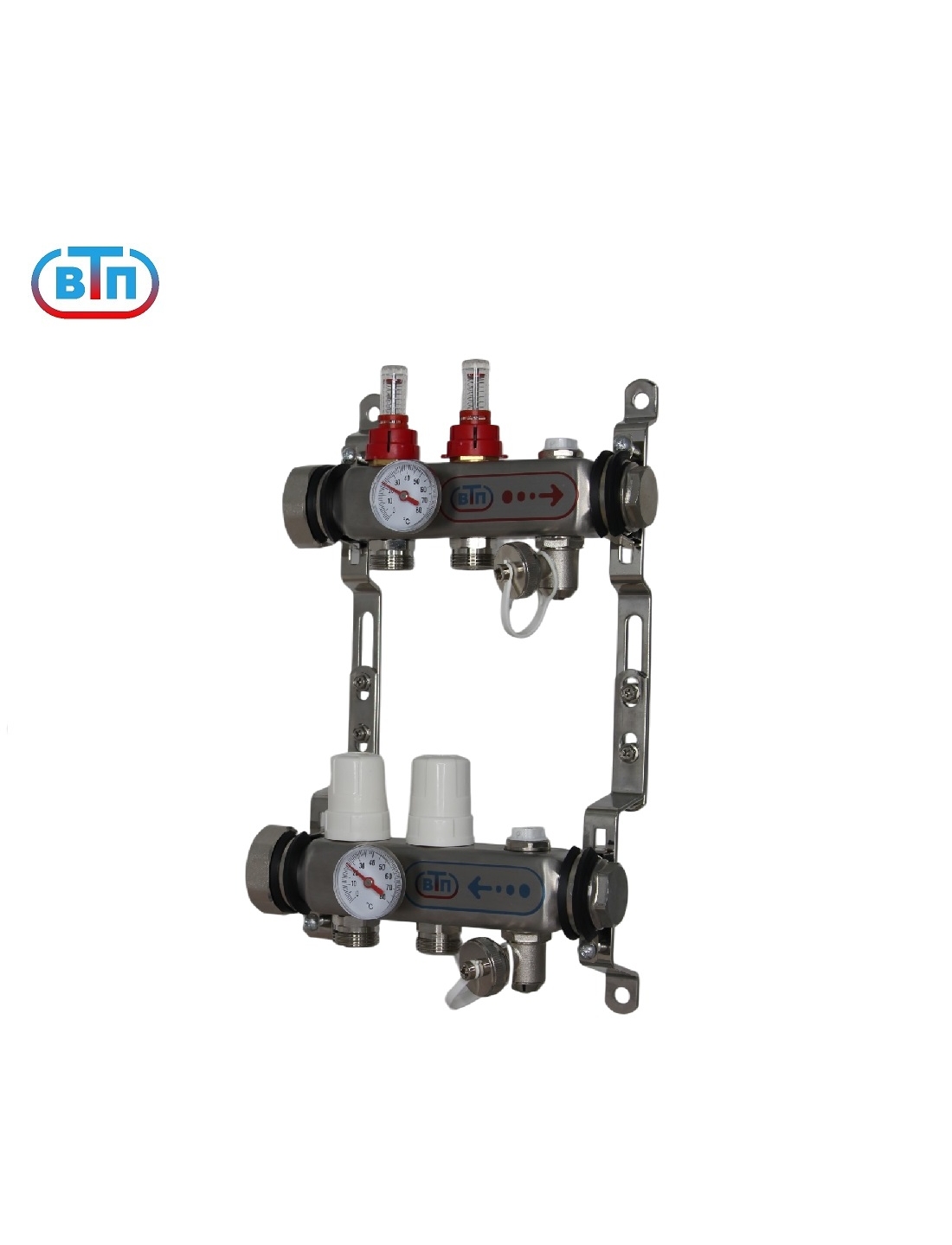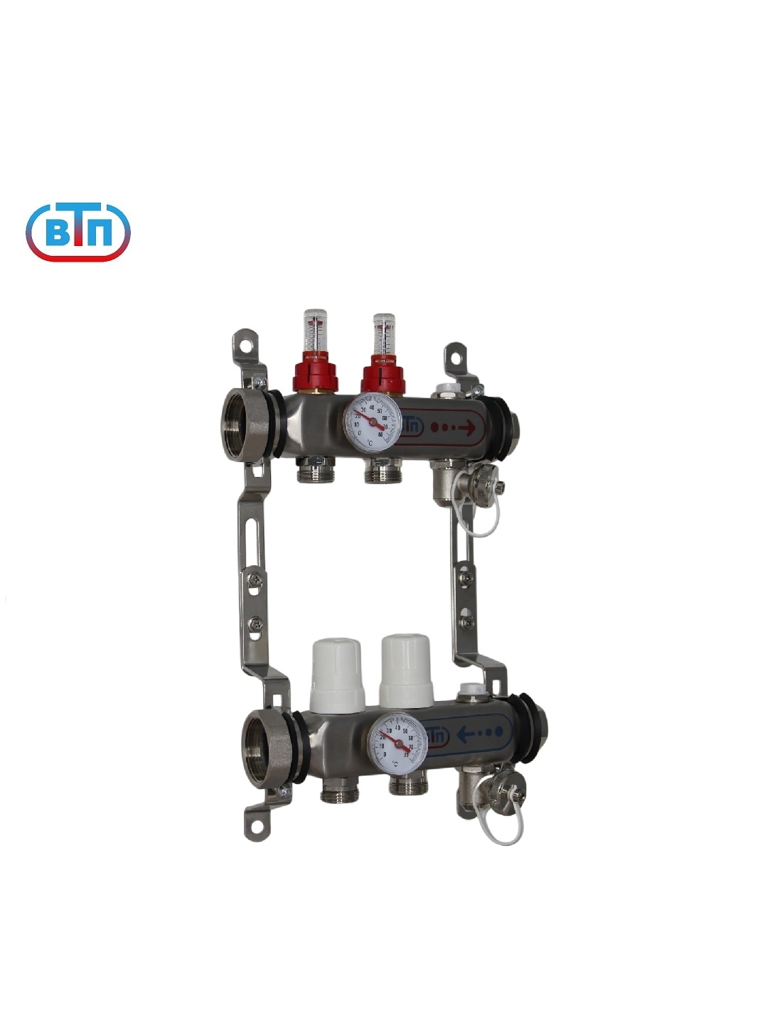 Из нержавеющей стали. Расходомеры "Taconova" (Швеция), регулирующие вентили. С обоих торцов внутренняя резьба 1", с одной стороны заглушки 1", надежные ручные воздухоспускники, поворотные дренажные вентили (никелированная латунь). Раздвижные кронштейны. Предназначена для подключения 2 контуров. С левой стороны коллекторов резьбовые отверстия 1" с накидной гайкой , с правой стороны заглушки 1". Выход каждого контура снабжён регулирующим вентилем с резьбовым монтажным элементом, предназначенным для установки сервопривода или термоголовки с резьбой М30х1,5. На лицевой стороне коллекторов смонтированы защитные гильзы, в которые устанавливаются биметаллические термометры Ф40мм, со шкалой 0-80 гр.С. Ручные клапаны отвода воздуха исключают опасность самопроизвольного вытекания теплоносителя. Выход дренажного вентили поворачивается на 360 градусов, совместим соединителями «Евроконус». Обладает плавным открытием. Для присоединения трубопроводов выводы коллекторов выполнены с геометрией для подключения соединителей стандарта «Евроконус».