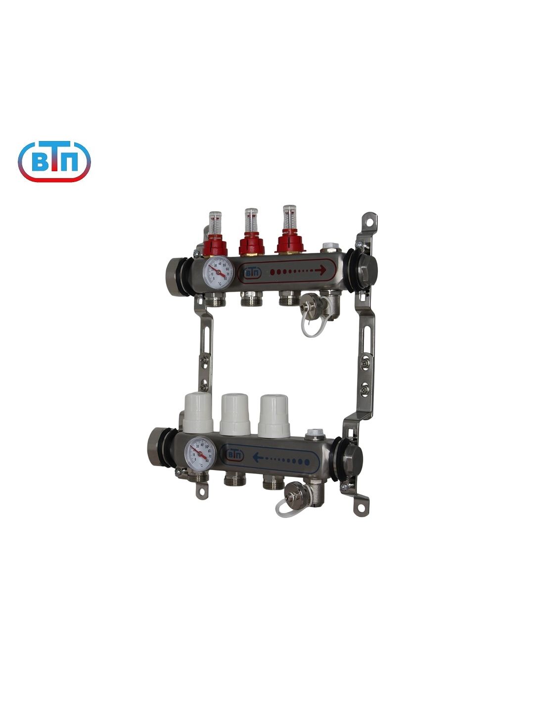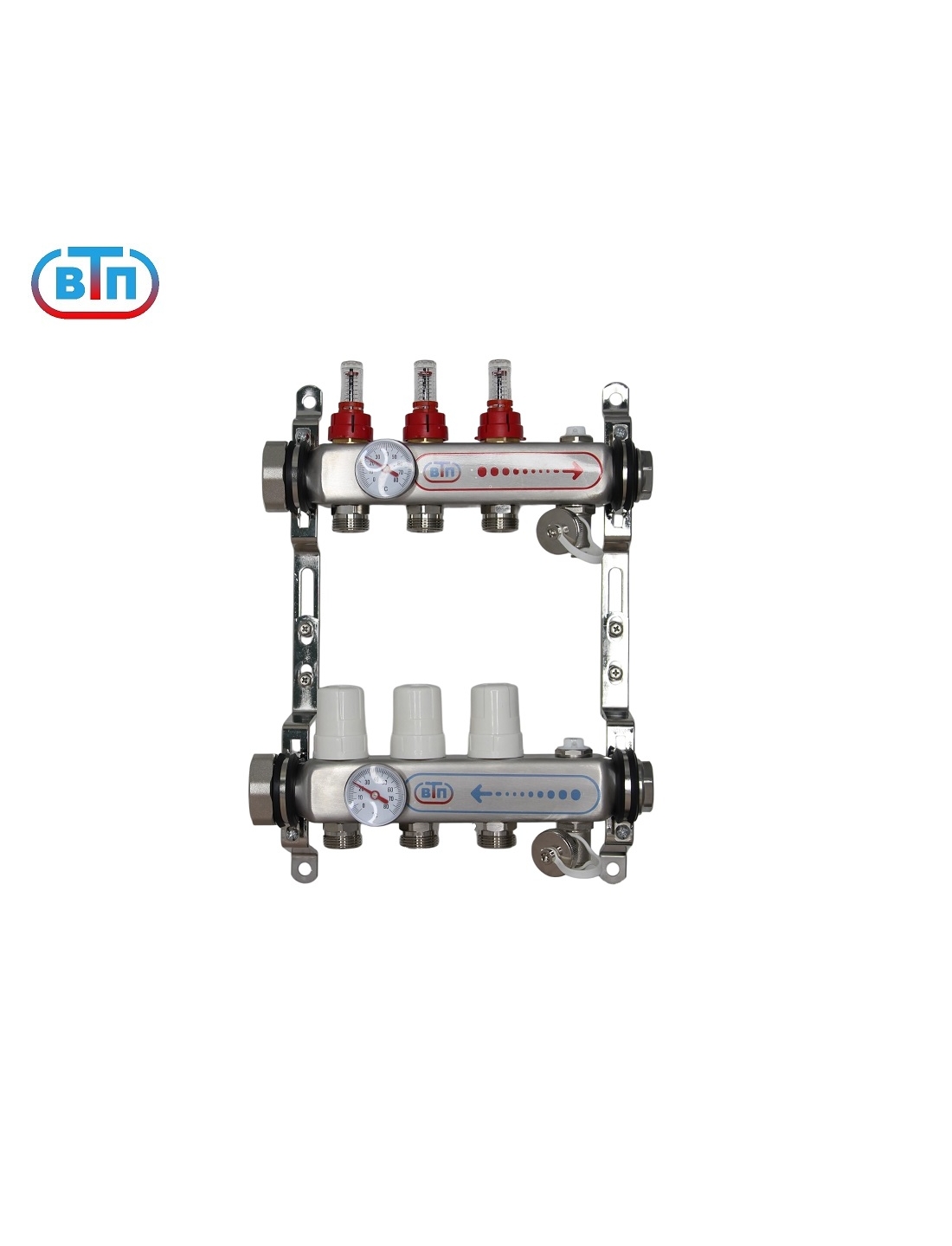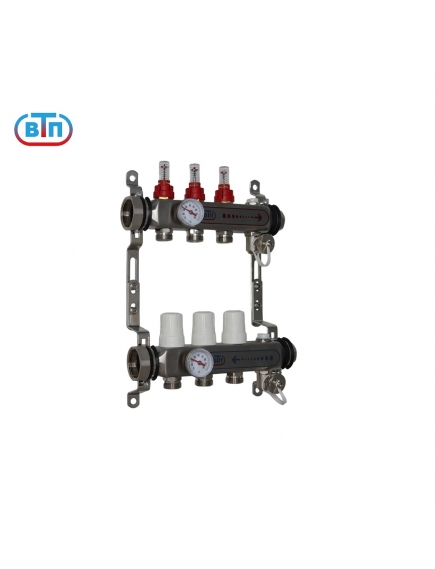 Из нержавеющей стали. Расходомеры "Taconova" (Швеция), регулирующие вентили. С обоих торцов внутренняя резьба 1", с одной стороны заглушки 1", надежные ручные воздухоспускники, поворотные дренажные вентили (никелированная латунь). Раздвижные кронштейны. Предназначена для подключения 3 контуров. С левой стороны коллекторов резьбовые отверстия 1" с накидной гайкой , с правой стороны заглушки 1". Выход каждого контура снабжён регулирующим вентилем с резьбовым монтажным элементом, предназначенным для установки сервопривода или термоголовки с резьбой М30х1,5. На лицевой стороне коллекторов смонтированы защитные гильзы, в которые устанавливаются биметаллические термометры Ф40мм, со шкалой 0-80 гр.С. Ручные клапаны отвода воздуха исключают опасность самопроизвольного вытекания теплоносителя. Выход дренажного вентили поворачивается на 360 градусов, совместим соединителями «Евроконус». Обладает плавным открытием. Для присоединения трубопроводов выводы коллекторов выполнены с геометрией для подключения соединителей стандарта «Евроконус».