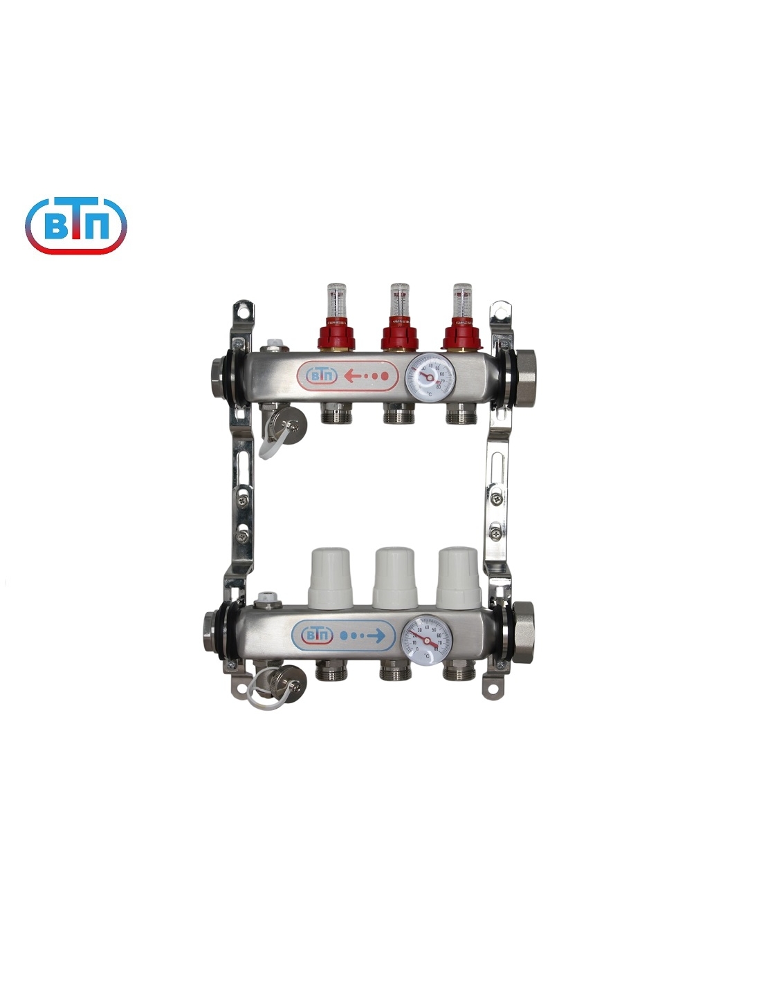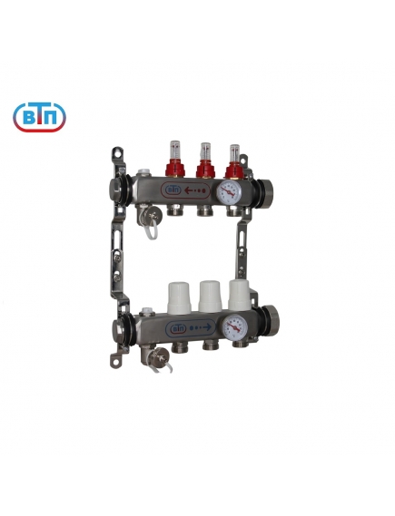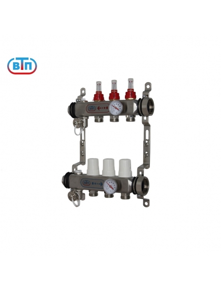 Из нержавеющей стали. Расходомеры "Taconova" (Швеция), регулирующие вентили. С обоих торцов внутренняя резьба 1", с одной стороны заглушки 1", надежные ручные воздухоспускники, поворотные дренажные вентили (никелированная латунь). Раздвижные кронштейны. Предназначена для подключения 3 контуров. С правой стороны коллекторов резьбовые отверстия 1" с накидной гайкой , с левой стороны заглушки 1". Выход каждого контура снабжён регулирующим вентилем с резьбовым монтажным элементом, предназначенным для установки сервопривода или термоголовки с резьбой М30х1,5. На лицевой стороне коллекторов смонтированы защитные гильзы, в которые устанавливаются биметаллические термометры Ф40мм, со шкалой 0-80 гр.С. Ручные клапаны отвода воздуха исключают опасность самопроизвольного вытекания теплоносителя. Выход дренажного вентили поворачивается на 360 градусов, совместим соединителями «Евроконус». Обладает плавным открытием. Для присоединения трубопроводов выводы коллекторов выполнены с геометрией для подключения соединителей стандарта «Евроконус».