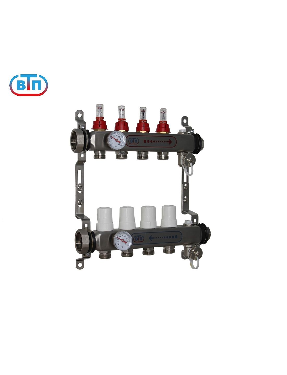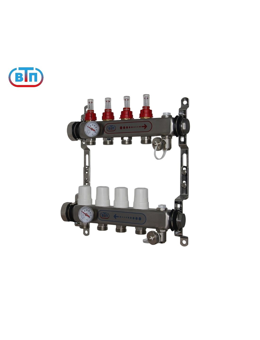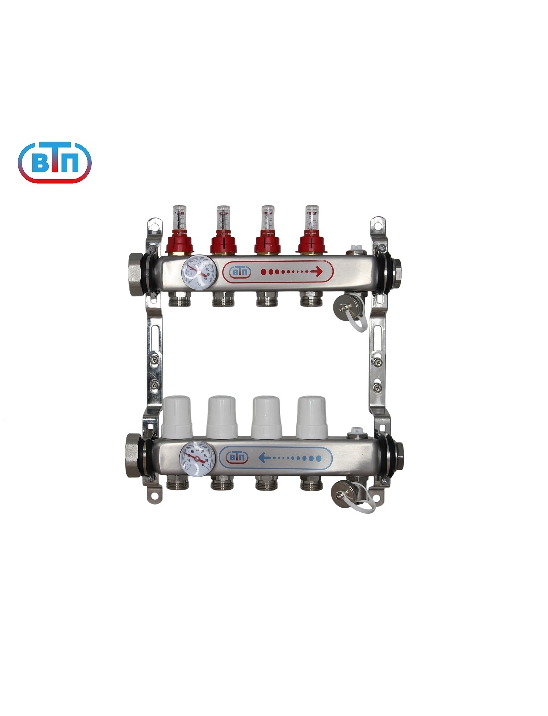 Из нержавеющей стали. Расходомеры "Taconova" (Швеция), регулирующие вентили. С обоих торцов внутренняя резьба 1", с одной стороны заглушки 1", надежные ручные воздухоспускники, поворотные дренажные вентили (никелированная латунь). Раздвижные кронштейны. Предназначена для подключения 4 контуров. С левой стороны коллекторов резьбовые отверстия 1" с накидной гайкой , с правой стороны заглушки 1". Выход каждого контура снабжён регулирующим вентилем с резьбовым монтажным элементом, предназначенным для установки сервопривода или термоголовки с резьбой М30х1,5. На лицевой стороне коллекторов смонтированы защитные гильзы, в которые устанавливаются биметаллические термометры Ф40мм, со шкалой 0-80 гр.С. Ручные клапаны отвода воздуха исключают опасность самопроизвольного вытекания теплоносителя. Выход дренажного вентили поворачивается на 360 градусов, совместим соединителями «Евроконус». Обладает плавным открытием. Для присоединения трубопроводов выводы коллекторов выполнены с геометрией для подключения соединителей стандарта «Евроконус».