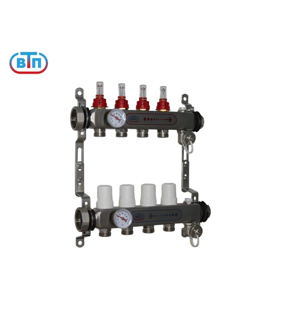Из нержавеющей стали. Расходомеры "Taconova" (Швеция). Биметаллические термометры Ф40мм со шкалой 0-80 гр.С. С правой стороны заглушки 1", надежные ручные воздухоспускники, поворотные дренажные клапаны (никелированная латунь). Раздвижные кронштейны. Выход каждого контура снабжён регулирующим вентилем с резьбовым монтажным элементом, предназначенным для установки сервопривода или термоголовки с резьбой М30х1,5. Для присоединения трубопроводов выводы коллекторов выполнены с геометрией для подключения соединителей стандарта «Евроконус».