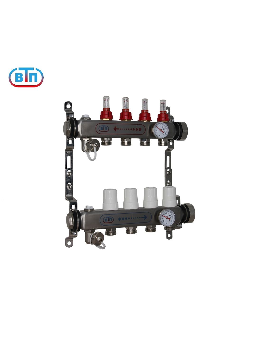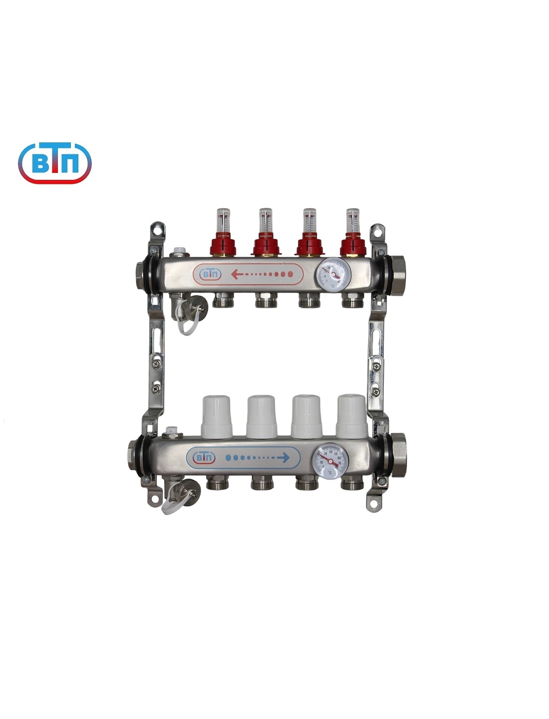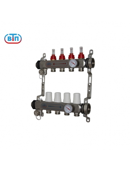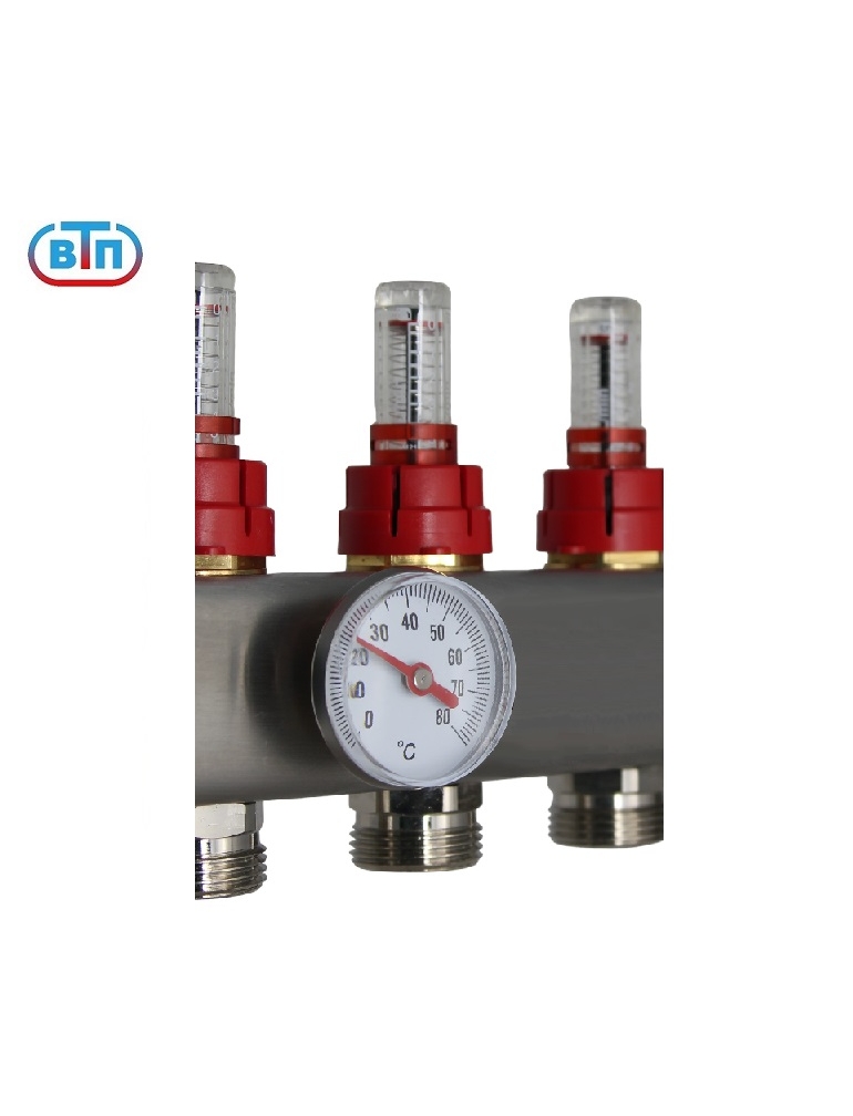 Из нержавеющей стали. Расходомеры "Taconova" (Швеция), регулирующие вентили. С обоих торцов внутренняя резьба 1", с одной стороны заглушки 1", надежные ручные воздухоспускники, поворотные дренажные вентили (никелированная латунь). Раздвижные кронштейны. Предназначена для подключения 4 контуров. С правой стороны коллекторов резьбовые отверстия 1" с накидной гайкой , с левой стороны заглушки 1". Выход каждого контура снабжён регулирующим вентилем с резьбовым монтажным элементом, предназначенным для установки сервопривода или термоголовки с резьбой М30х1,5. На лицевой стороне коллекторов смонтированы защитные гильзы, в которые устанавливаются биметаллические термометры Ф40мм, со шкалой 0-80 гр.С. Ручные клапаны отвода воздуха исключают опасность самопроизвольного вытекания теплоносителя. Выход дренажного вентили поворачивается на 360 градусов, совместим соединителями «Евроконус». Обладает плавным открытием. Для присоединения трубопроводов выводы коллекторов выполнены с геометрией для подключения соединителей стандарта «Евроконус».