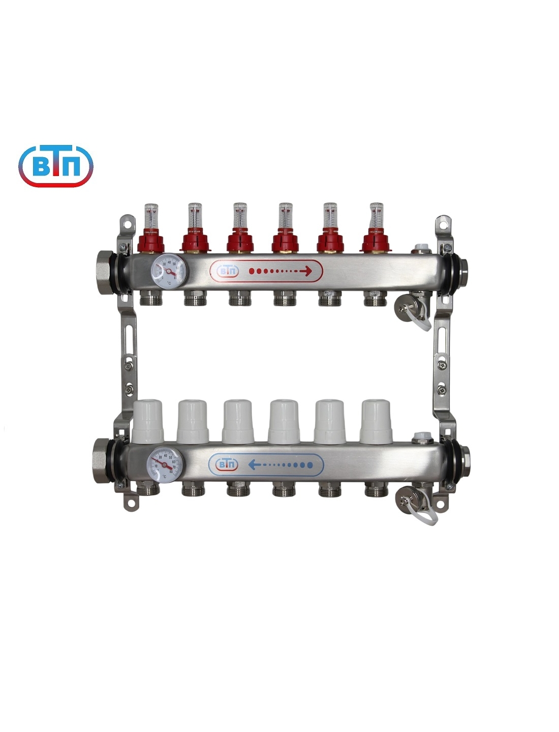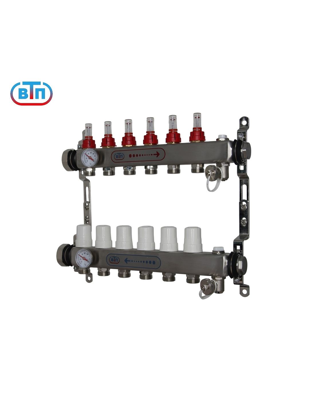 Из нержавеющей стали. Расходомеры "Taconova" (Швеция), регулирующие вентили. С обоих торцов внутренняя резьба 1", с одной стороны заглушки 1", надежные ручные воздухоспускники, поворотные дренажные вентили (никелированная латунь). Раздвижные кронштейны. Предназначена для подключения 6 контуров. С левой стороны коллекторов резьбовые отверстия 1" с накидной гайкой , с правой стороны заглушки 1". Выход каждого контура снабжён регулирующим вентилем с резьбовым монтажным элементом, предназначенным для установки сервопривода или термоголовки с резьбой М30х1,5. На лицевой стороне коллекторов смонтированы защитные гильзы, в которые устанавливаются биметаллические термометры Ф40мм, со шкалой 0-80 гр.С. Ручные клапаны отвода воздуха исключают опасность самопроизвольного вытекания теплоносителя. Выход дренажного вентили поворачивается на 360 градусов, совместим соединителями «Евроконус». Обладает плавным открытием. Для присоединения трубопроводов выводы коллекторов выполнены с геометрией для подключения соединителей стандарта «Евроконус».