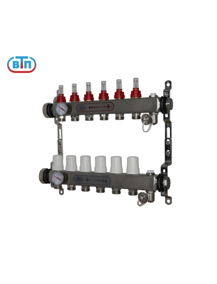 Коллекторная группа 6 контуров, накидные гайки 1.1/4" слева, БМ термометры А40.Ртн.06.НГ/ВР.БТ ВТП