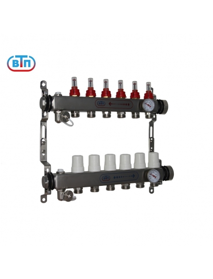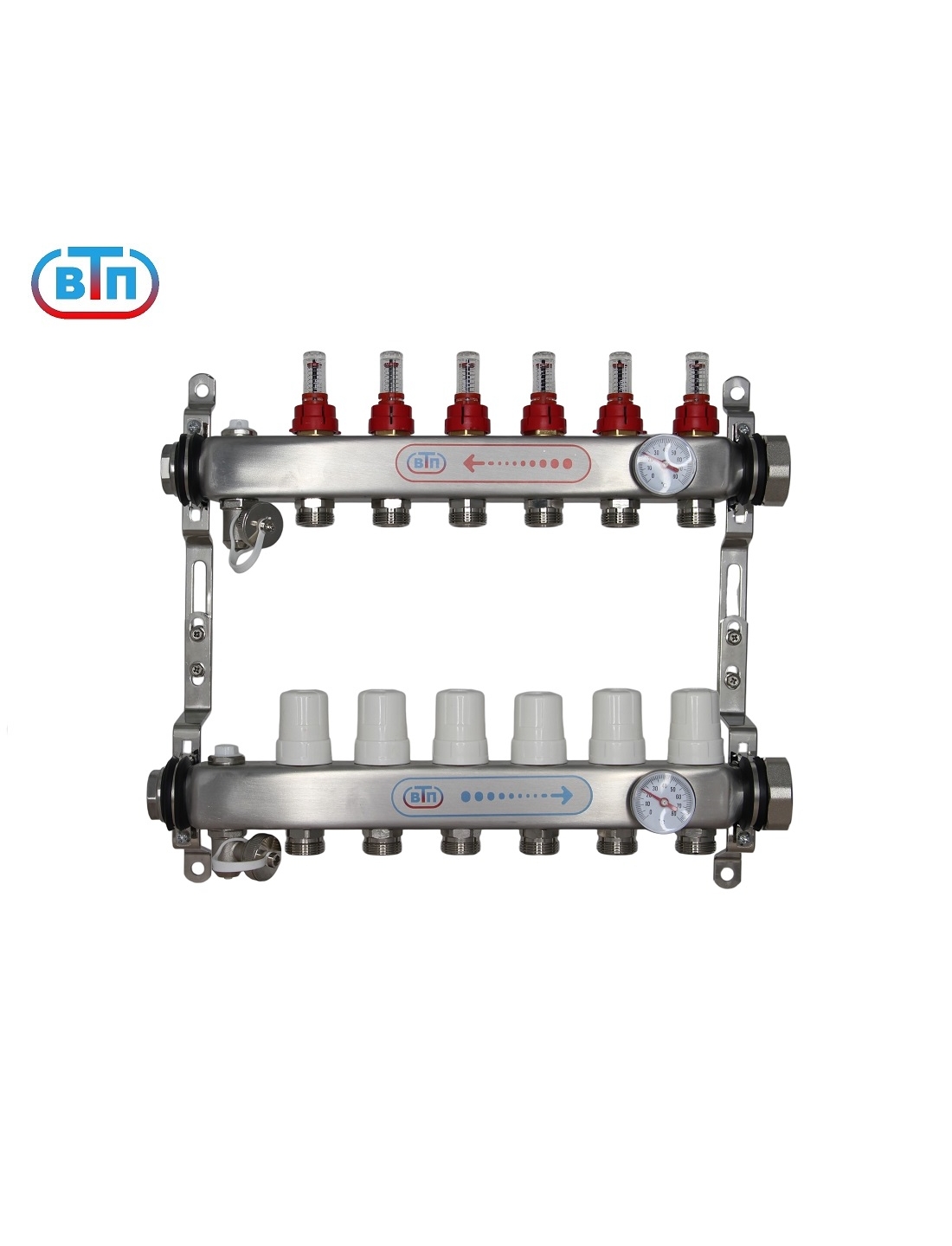 Из нержавеющей стали. Расходомеры "Taconova" (Швеция), регулирующие вентили. С обоих торцов внутренняя резьба 1", с одной стороны заглушки 1", надежные ручные воздухоспускники, поворотные дренажные вентили (никелированная латунь). Раздвижные кронштейны. Предназначена для подключения 6 контуров. С правой стороны коллекторов резьбовые отверстия 1" с накидной гайкой , с левой стороны заглушки 1". Выход каждого контура снабжён регулирующим вентилем с резьбовым монтажным элементом, предназначенным для установки сервопривода или термоголовки с резьбой М30х1,5. На лицевой стороне коллекторов смонтированы защитные гильзы, в которые устанавливаются биметаллические термометры Ф40мм, со шкалой 0-80 гр.С. Ручные клапаны отвода воздуха исключают опасность самопроизвольного вытекания теплоносителя. Выход дренажного вентили поворачивается на 360 градусов, совместим соединителями «Евроконус». Обладает плавным открытием. Для присоединения трубопроводов выводы коллекторов выполнены с геометрией для подключения соединителей стандарта «Евроконус».