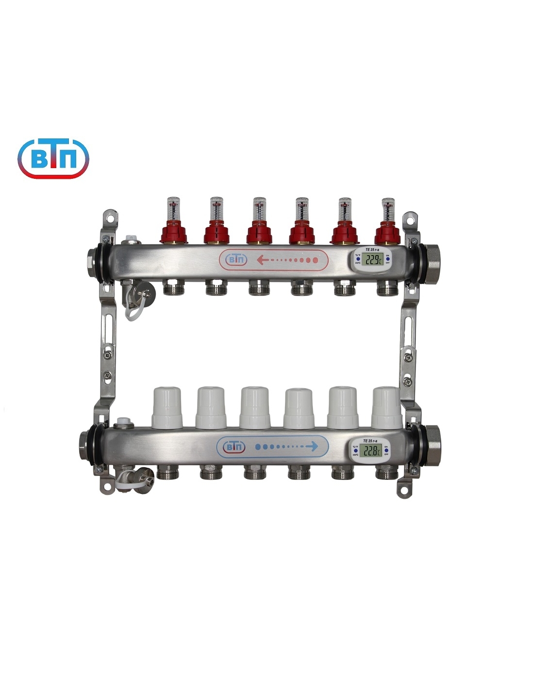 Коллекторная группа 6 контуров, накидные гайки 1.1/4" справа, электронные термометры А40.Ртн.06.ВР/НГ.ЭТ ВТП