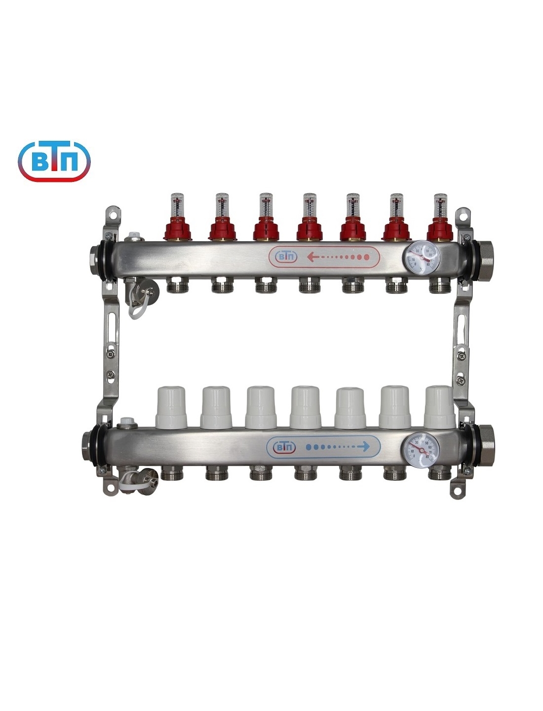 Из нержавеющей стали. Расходомеры "Taconova" (Швеция), регулирующие вентили. С обоих торцов внутренняя резьба 1", с одной стороны заглушки 1", надежные ручные воздухоспускники, поворотные дренажные вентили (никелированная латунь). Раздвижные кронштейны. Предназначена для подключения 7 контуров. С правой стороны коллекторов резьбовые отверстия 1" с накидной гайкой , с левой стороны заглушки 1". Выход каждого контура снабжён регулирующим вентилем с резьбовым монтажным элементом, предназначенным для установки сервопривода или термоголовки с резьбой М30х1,5. На лицевой стороне коллекторов смонтированы защитные гильзы, в которые устанавливаются биметаллические термометры Ф40мм, со шкалой 0-80 гр.С. Ручные клапаны отвода воздуха исключают опасность самопроизвольного вытекания теплоносителя. Выход дренажного вентили поворачивается на 360 градусов, совместим соединителями «Евроконус». Обладает плавным открытием. Для присоединения трубопроводов выводы коллекторов выполнены с геометрией для подключения соединителей стандарта «Евроконус».