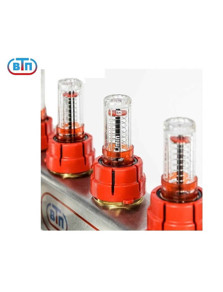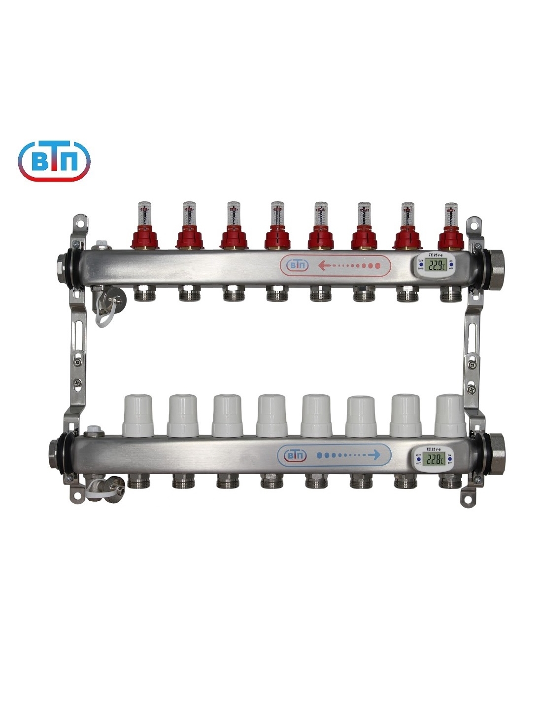 Из нержавеющей стали. Расходомеры "Taconova" (Швеция), регулирующие вентили. С обоих торцов внутренняя резьба 1", с одной стороны заглушки 1", надежные ручные воздухоспускники, поворотные дренажные вентили (никелированная латунь). Раздвижные кронштейны. Предназначена для подключения 8 контуров. С правой стороны коллекторов резьбовые отверстия 1" с накидной гайкой , с левой стороны заглушки 1". Выход каждого контура снабжён регулирующим вентилем с резьбовым монтажным элементом, предназначенным для установки сервопривода или термоголовки с резьбой М30х1,5. На лицевой стороне коллекторов смонтированы защитные гильзы. в которые устанавливаются электронные термометры ТЕ25r/a, с шагом измерений 0,1гр.С.. Ручные клапаны отвода воздуха исключают опасность самопроизвольного вытекания теплоносителя. Выход дренажного вентили поворачивается на 360 градусов, совместим соединителями «Евроконус». Обладает плавным открытием. Для присоединения трубопроводов выводы коллекторов выполнены с геометрией для подключения соединителей стандарта «Евроконус».
