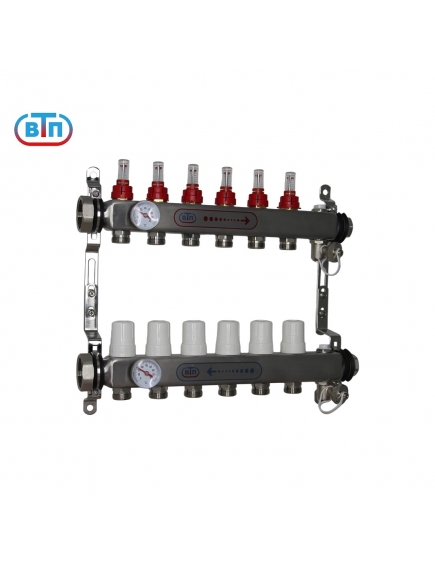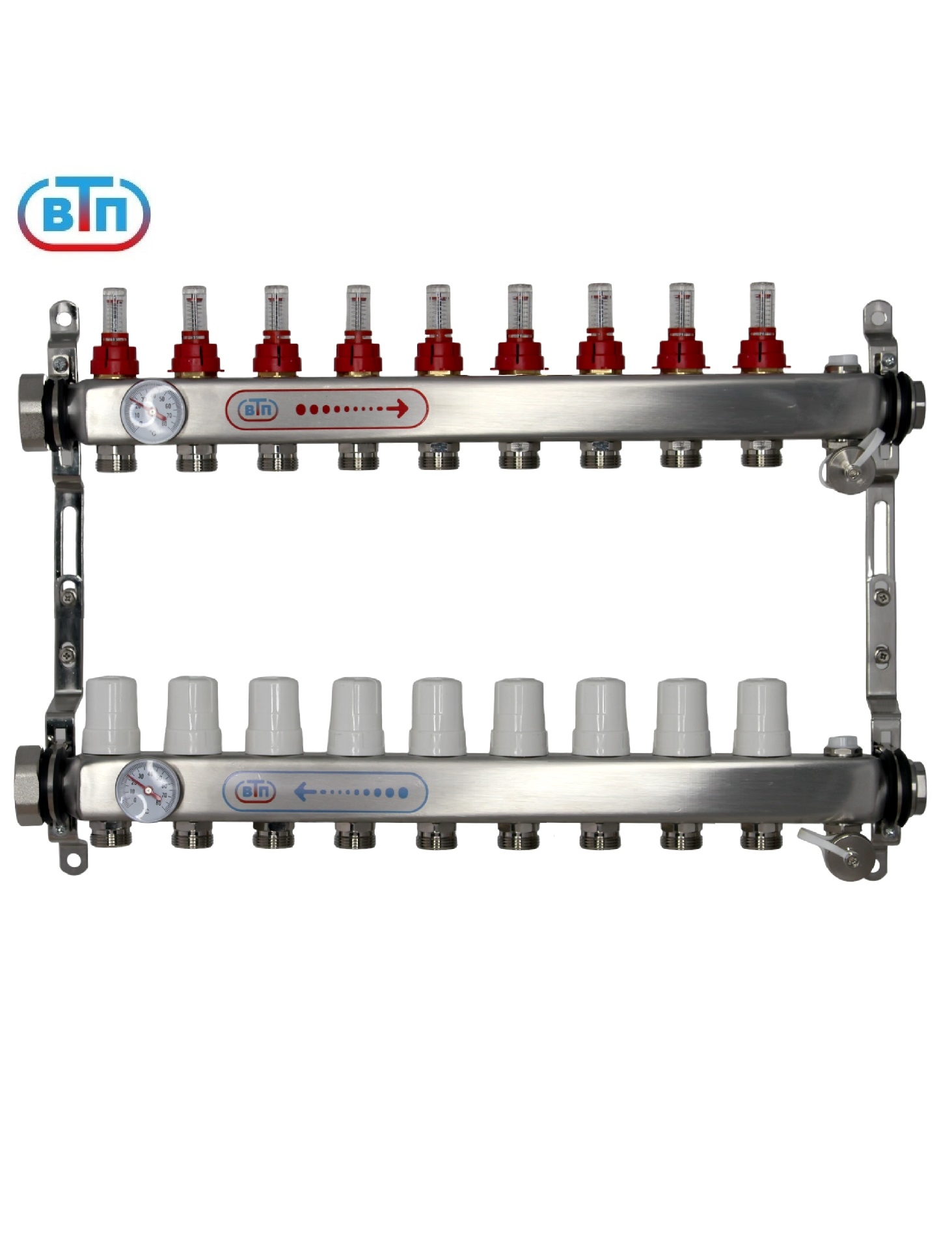 Из нержавеющей стали. Расходомеры "Taconova" (Швеция), регулирующие вентили. С обоих торцов внутренняя резьба 1", с одной стороны заглушки 1", надежные ручные воздухоспускники, поворотные дренажные вентили (никелированная латунь). Раздвижные кронштейны. Предназначена для подключения 9 контуров. С левой стороны коллекторов резьбовые отверстия 1" с накидной гайкой , с правой стороны заглушки 1". Выход каждого контура снабжён регулирующим вентилем с резьбовым монтажным элементом, предназначенным для установки сервопривода или термоголовки с резьбой М30х1,5. На лицевой стороне коллекторов смонтированы защитные гильзы, в которые устанавливаются биметаллические термометры Ф40мм, со шкалой 0-80 гр.С. Ручные клапаны отвода воздуха исключают опасность самопроизвольного вытекания теплоносителя. Выход дренажного вентили поворачивается на 360 градусов, совместим соединителями «Евроконус». Обладает плавным открытием. Для присоединения трубопроводов выводы коллекторов выполнены с геометрией для подключения соединителей стандарта «Евроконус».