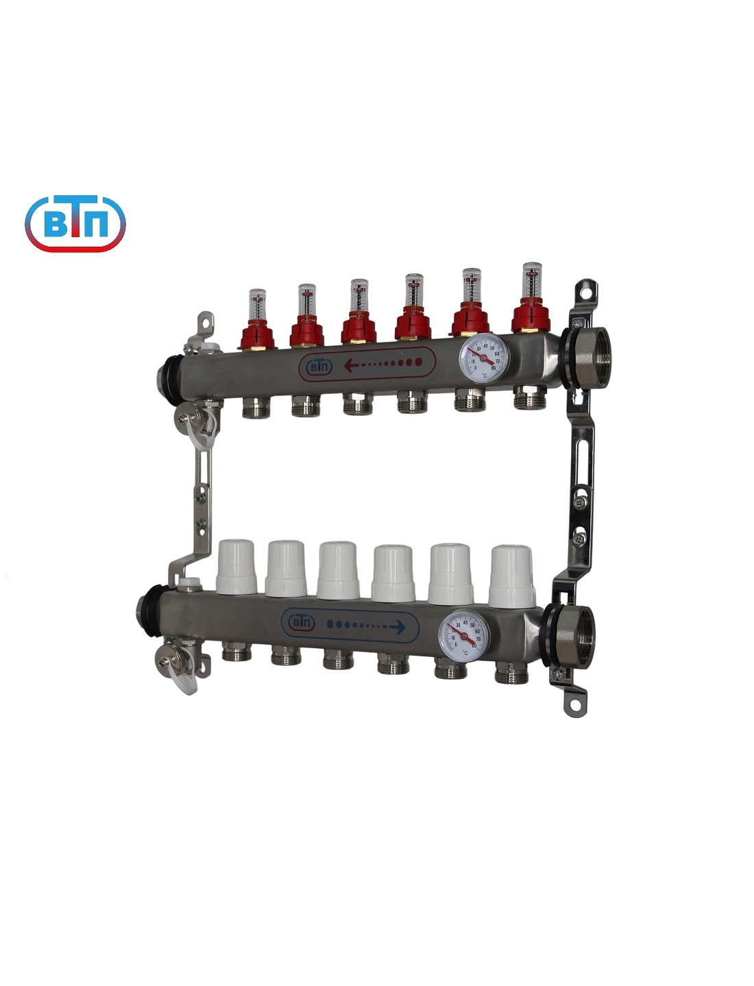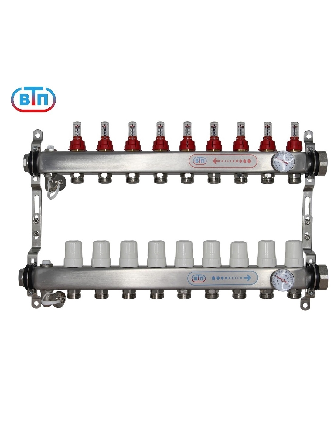 Из нержавеющей стали. Расходомеры "Taconova" (Швеция), регулирующие вентили. С обоих торцов внутренняя резьба 1", с одной стороны заглушки 1", надежные ручные воздухоспускники, поворотные дренажные вентили (никелированная латунь). Раздвижные кронштейны. Предназначена для подключения 9 контуров. С правой стороны коллекторов резьбовые отверстия 1" с накидной гайкой , с левой стороны заглушки 1". Выход каждого контура снабжён регулирующим вентилем с резьбовым монтажным элементом, предназначенным для установки сервопривода или термоголовки с резьбой М30х1,5. На лицевой стороне коллекторов смонтированы защитные гильзы, в которые устанавливаются биметаллические термометры Ф40мм, со шкалой 0-80 гр.С. Ручные клапаны отвода воздуха исключают опасность самопроизвольного вытекания теплоносителя. Выход дренажного вентили поворачивается на 360 градусов, совместим соединителями «Евроконус». Обладает плавным открытием. Для присоединения трубопроводов выводы коллекторов выполнены с геометрией для подключения соединителей стандарта «Евроконус».