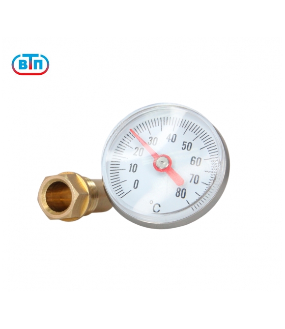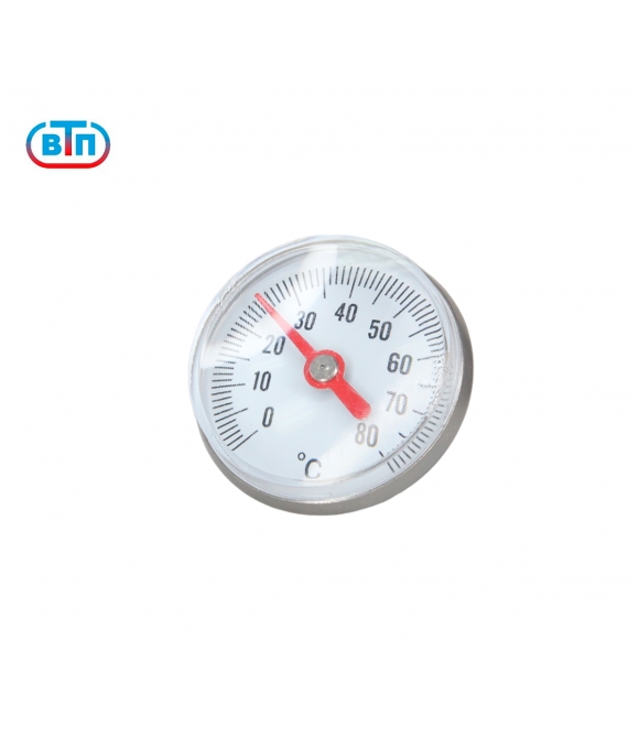 Аналоговый биметаллический термометр с гильзой имеет погружную гильзу с наружной резьбой 1/4" и диаметр корпуса 40 мм. Предназначен для измерения температуры до 80С. Такие термометры используются в большинстве оборудования касающегося теплых водяных полов. Гильза закручивается в отверстие диаметром 1/4", а сам прибор вставляется в нее.