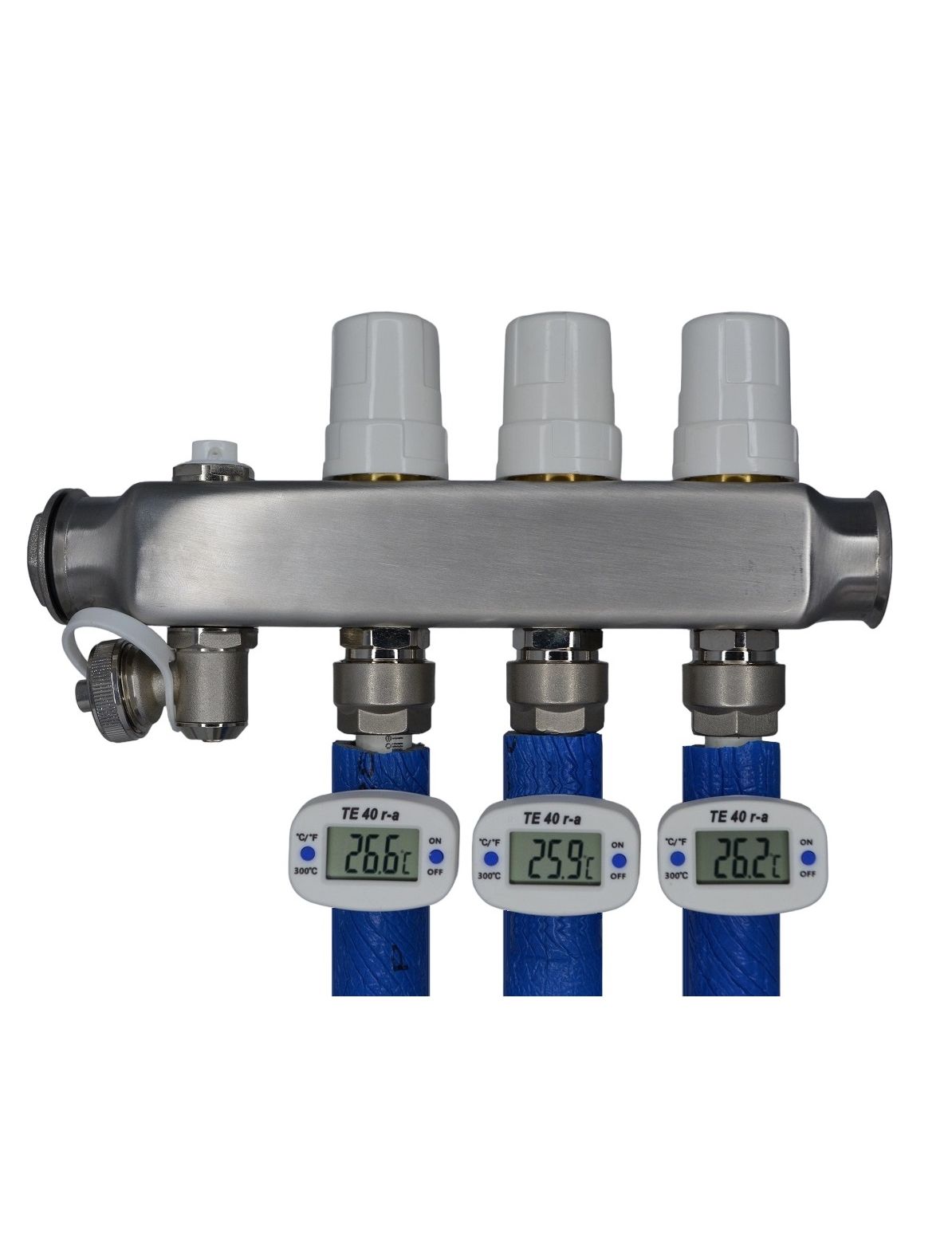 Инструкция по балансировке контуров водяного теплого пола с помощью цифровых термометров с щупом TE 40 r-a и настроечных клапанов с расходомерами по температуре на выходе из контура. Балансировка проводится при включенном циркуляционном насосе и открытых регулирующих клапанах на коллекторе подачи;