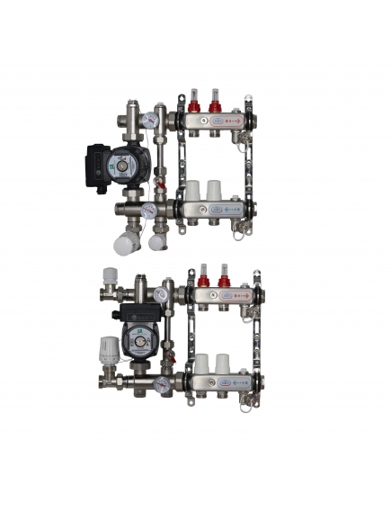 • Насосно-смесительный узел КОМБО-Б.П или КОМБО-Б.Л с встроенным байпасом, укомплектованный термостатической головкой ТСГ ВД с диапазоном задаваемых температур от 20 до 50 гр.С. и двумя регулирующими клапанами.