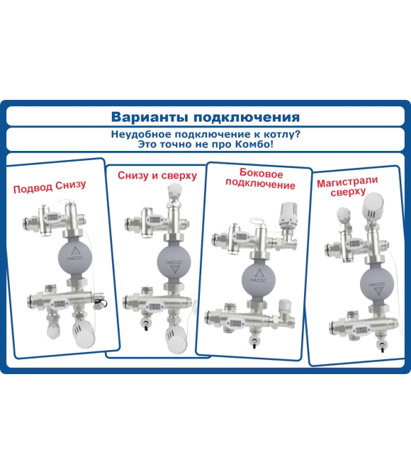 Комлект состоит из Насосно-смесительного узела КОМБО-Б, Коллекторной группы серии А40.Ртн.Нг/Вр. и частотного насоса PUMPMAN 25/40