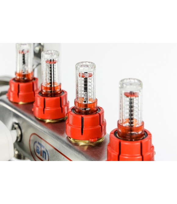 - Коллекторная обвязка для водяного теплого пола из нержавеющей стали со встроенными термометрами на коллекторах подачи и обратки, предназначена для системного распределения потока теплоносителя с давлением до 6 бар (Атм) и температурой до 70 ?С .