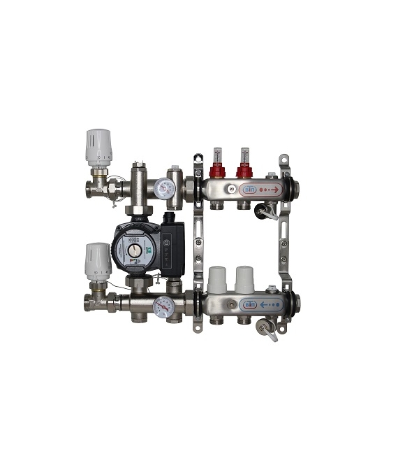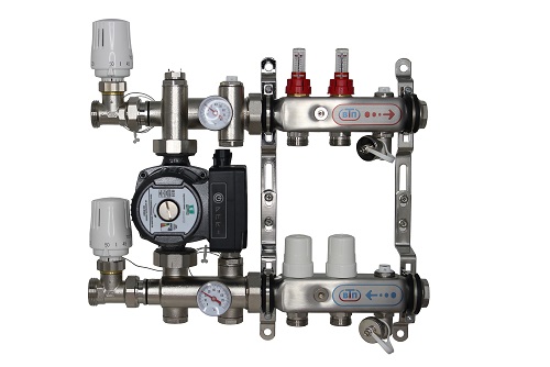 Термоадаптивный комплект водяного теплого пола КОМБО-ТА-Правый на 2 выхода, коллекторная группа со смесительным узлом и частотным насосом