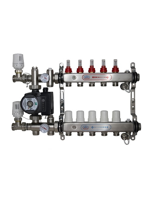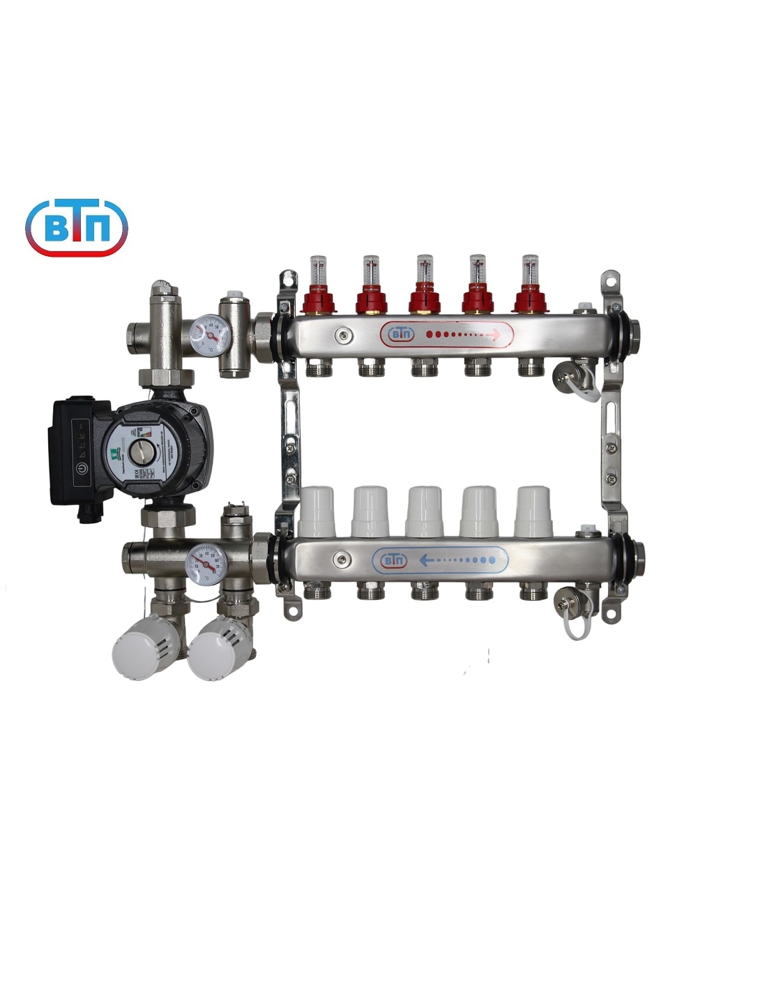 Полный коллекторный комплект -обвязка для водяного теплого пола ВТП КОМБО-ТА.П 5 контура с термоадаптивным насосно-смесительным узлом