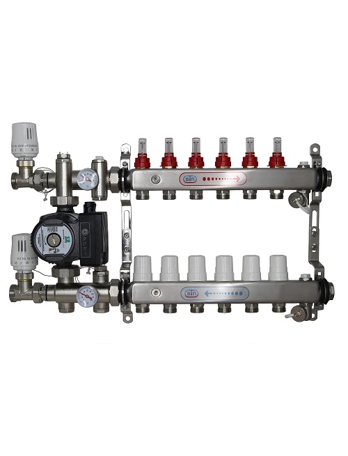 Полный коллекторный комплект -обвязка для водяного теплого пола ВТП КОМБО.П 6 контуров с термоадаптивным насосно-смесительным узлом