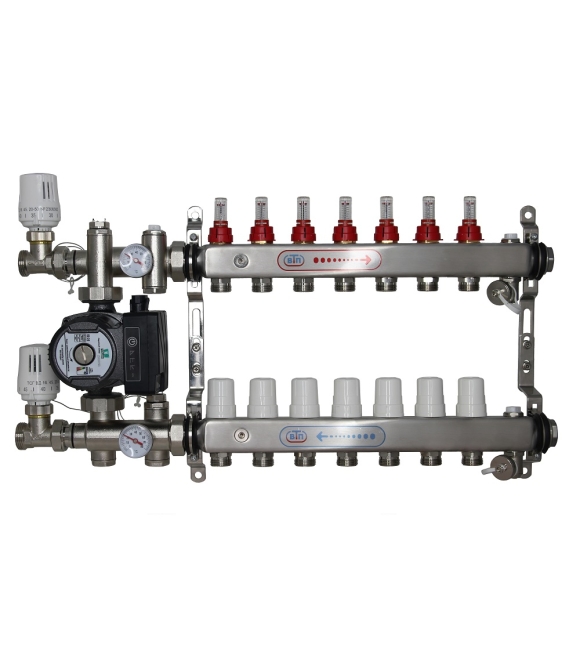 Термоадаптивный комплект водяного теплого пола КОМБО-ТА-Правый 7 выходов, коллекторная группа со смесительным узлом и частотным насосом