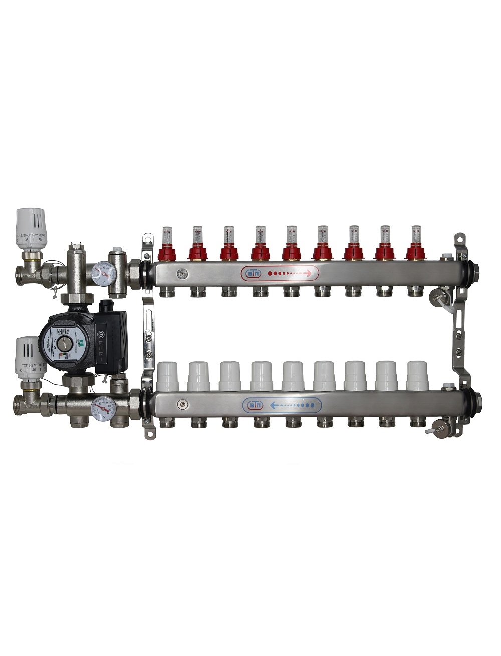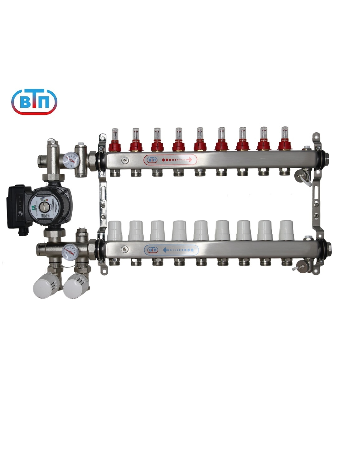 Полный коллекторный комплект -обвязка для водяного теплого пола ВТП КОМБО-ТА.П 9 контура с термоадаптивным насосно-смесительным узлом