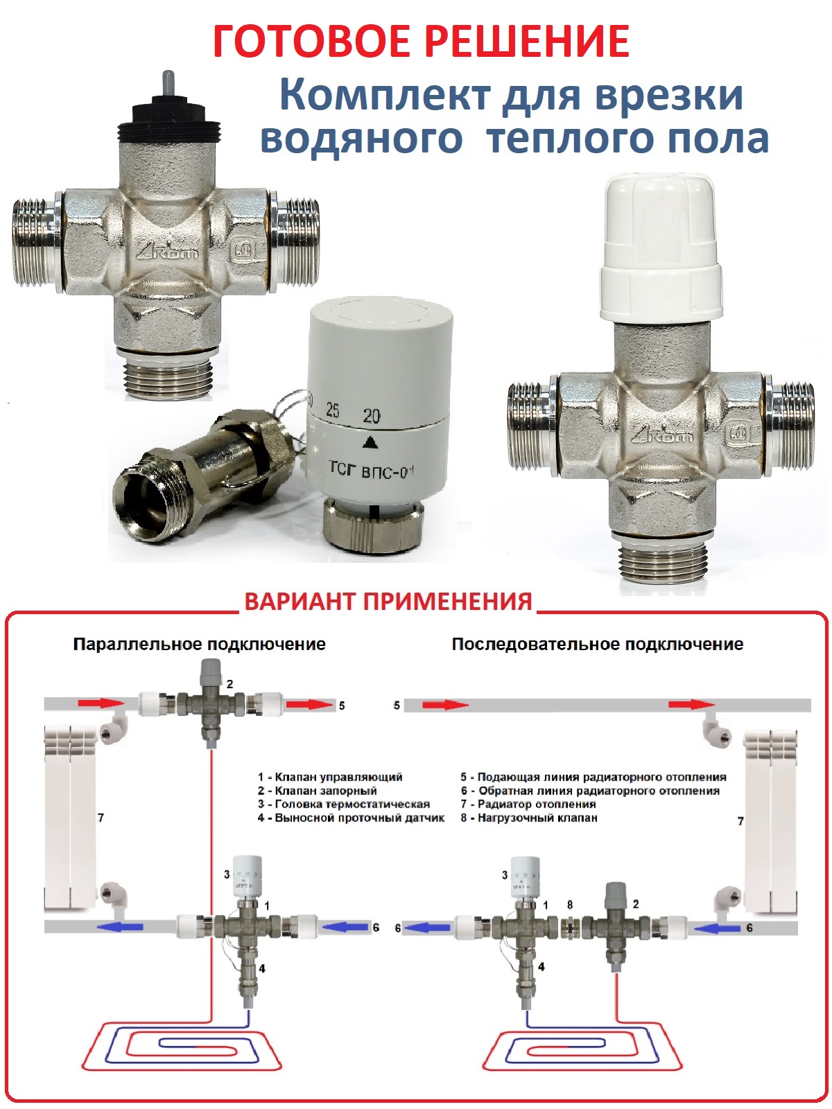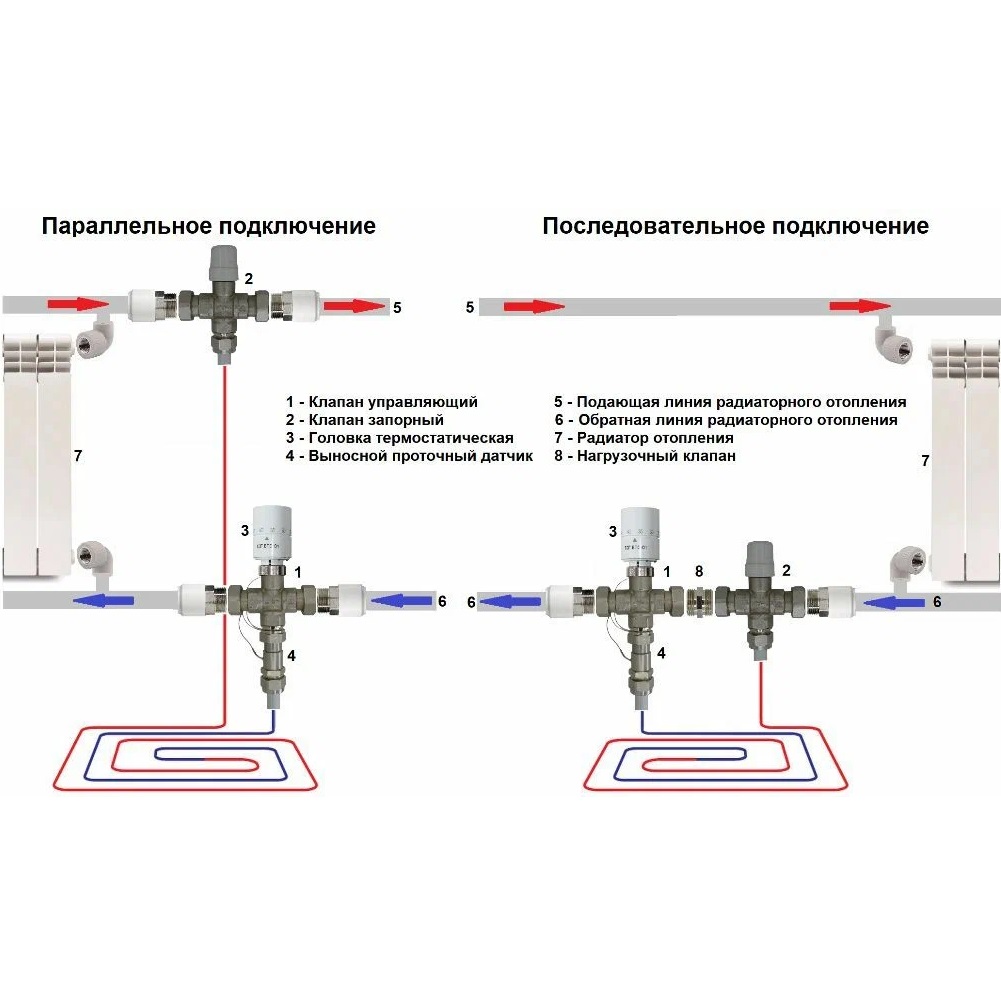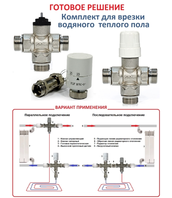 Основное назначение – подключение контура «Тёплого пола» к системе радиаторного отопления с принудительной циркуляцией. Циркуляция теплоносителя через контур «тёплого пола» обеспечивается за счет перепада давления, создаваемого насосом в радиаторной системе отопления. Установка обособленного циркуляционного насоса для контура «тёплого пола» в данном случае не требуется. Отводные удобны и для подключения других отопительных или охладительных приборов и оборудования, подключаемых параллельно основной магистрали. Отводные клапаны компактны и сопрягаемы с разными типами труб.