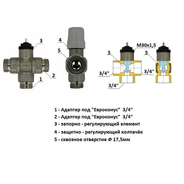 Клапан снабжён с трёх сторон адаптерами под «Евроконус» 3/4"
