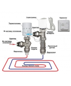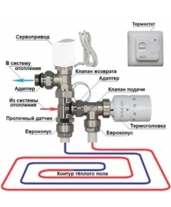 Наличие регулирующего клапана на входе и выходе контура «Тёплого пола» позволяет, при необходимости отключить контур от основной системы отопления. Клапан свободный от термостатической головки может быть оснащён сервоприводом, управляемым комнатным термостатом в зависимости от температуры воздуха в помещении и/или от температуры пола.