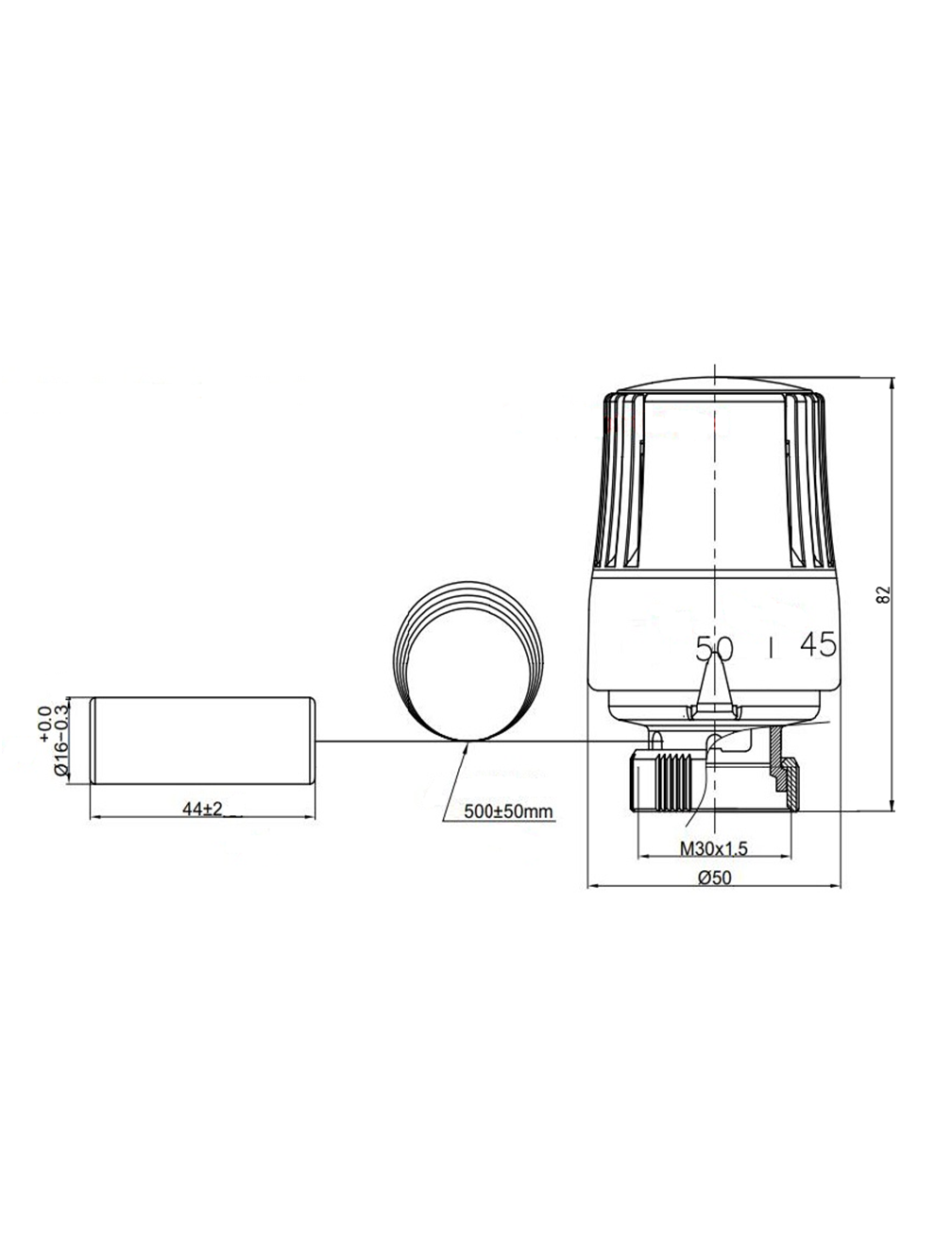 Датчик представляет из себя цилиндрический термобаллон длиной 44мм диаметром 16мм и требует для установки минимум пространства.