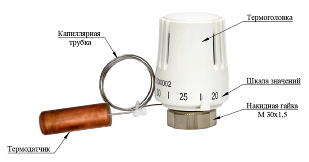 В корпусе термостатической головки находятся предохранительная пружина и сильфон, соединенный капиллярной трубкой длиной 0,5 м с термобаллоном.