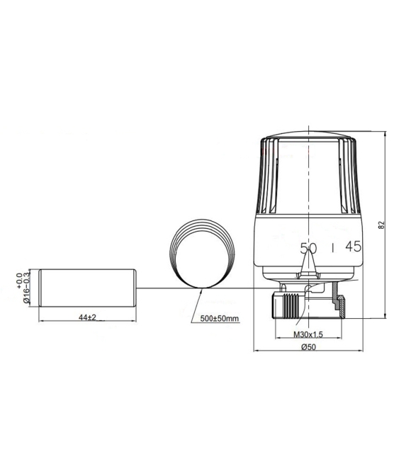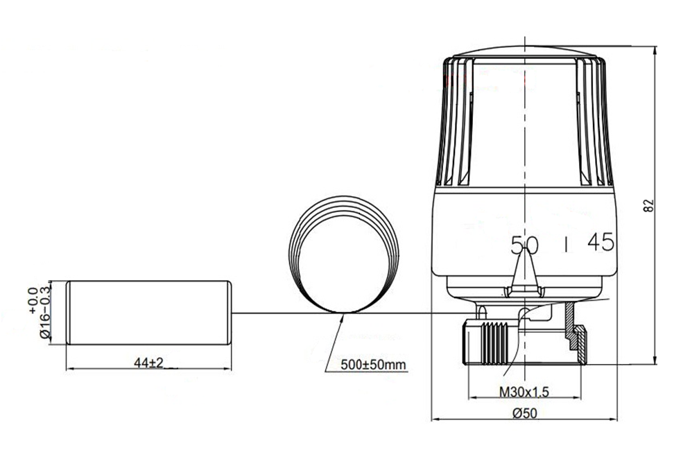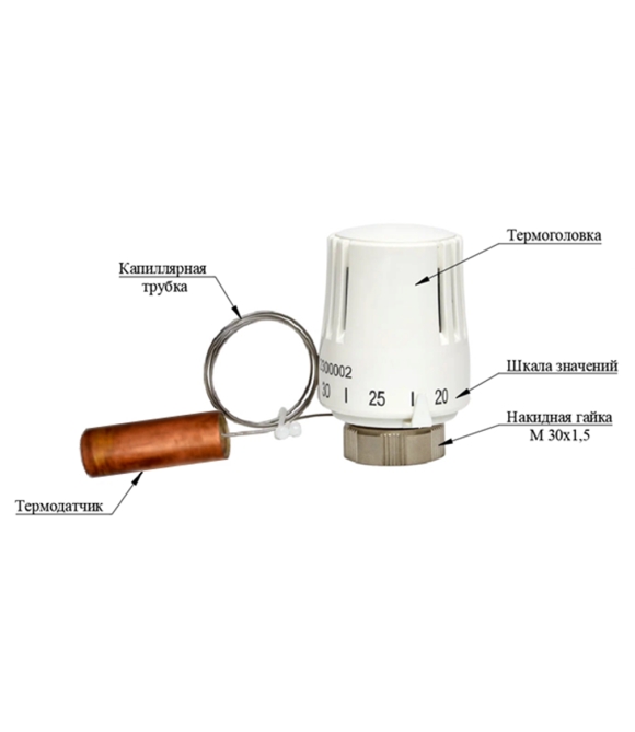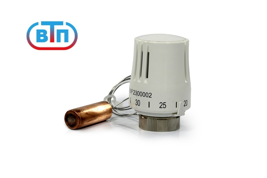 Использование термостатической головки с выносным датчиком позволяет поддерживать температуру теплоносителя во вторичном контуре с точностью до 1°С. Устройство работает в комплексе с регулирующими клапанами нажимного действия, имеющими резьбу для крепления исполнительного механизма М30х1,5. Корпус термоголовки оборудован настроечной шкалой. Необходимая температура устанавливается на термоголовке поворотом регулятора до совмещения нужного значения шкалы с указателем.