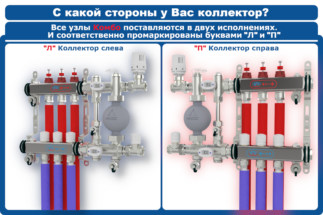- Собирать комбинированные системы отопления с одноместным расположением: Коллекторы радиаторного отопления + НСУ + коллекторы тёплого пола.
