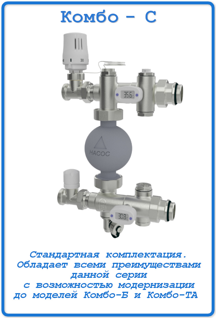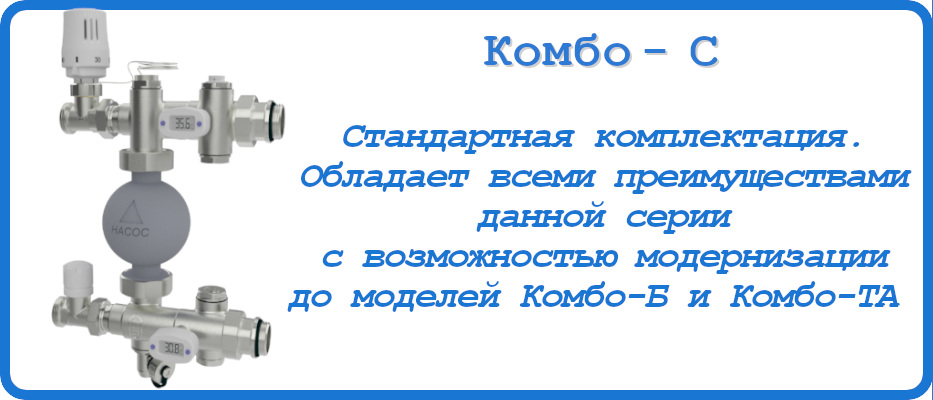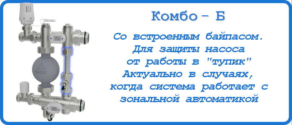 • Серия КОМБО-Б –со встроенным регулируемым байпасом. Позволяет обеспечить гарантированный расход теплоносителя через насос, предотвращая его выход из строя при использовании зонального управления на коллекторах.