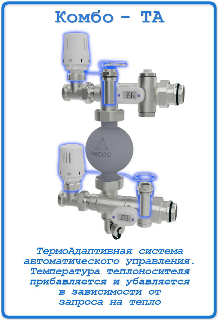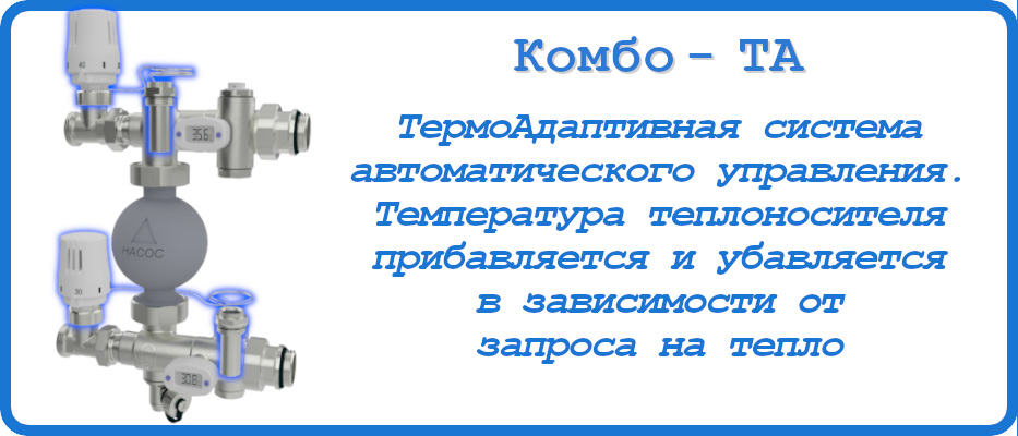 • Серия КОМБО-ТА с ТермоАдаптивным принципом, основанным на управлении температурой подаваемого теплоносителя в зависимости от фактической отдачи тепла через тёплый пол. Контролирует температуру теплоносителя, возвращающегося из греющих контуров.