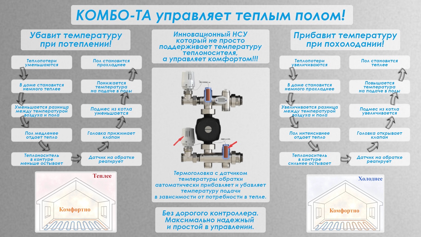 • ТА НСУ серии КОМБО Принцип управления основан на контроле температуры теплоносителя возвращающегося из контуров тёплого пола.