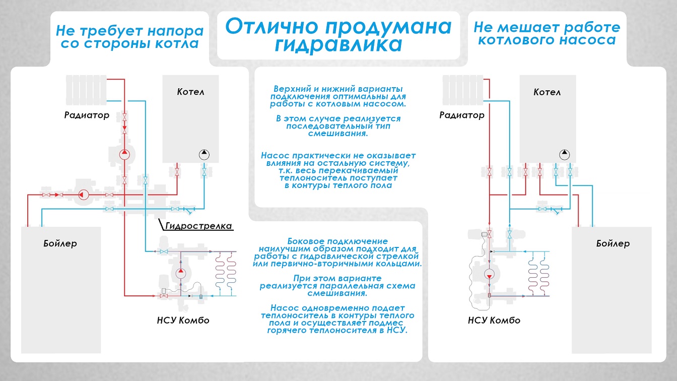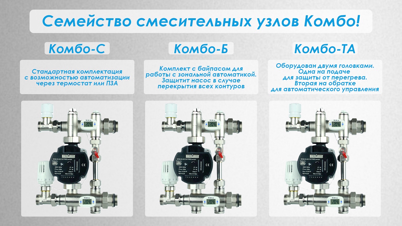 • НСУ серии КОМБО - Б со встроенным регулируемым байпасом. Позволяет обеспечить гарантированный расход теплоносителя через насос, предотвращая его выход из строя и увеличить скорости прогрева системы отопления. Позволяют реализовать параллельный или последовательный тип смешивания теплоносителя.