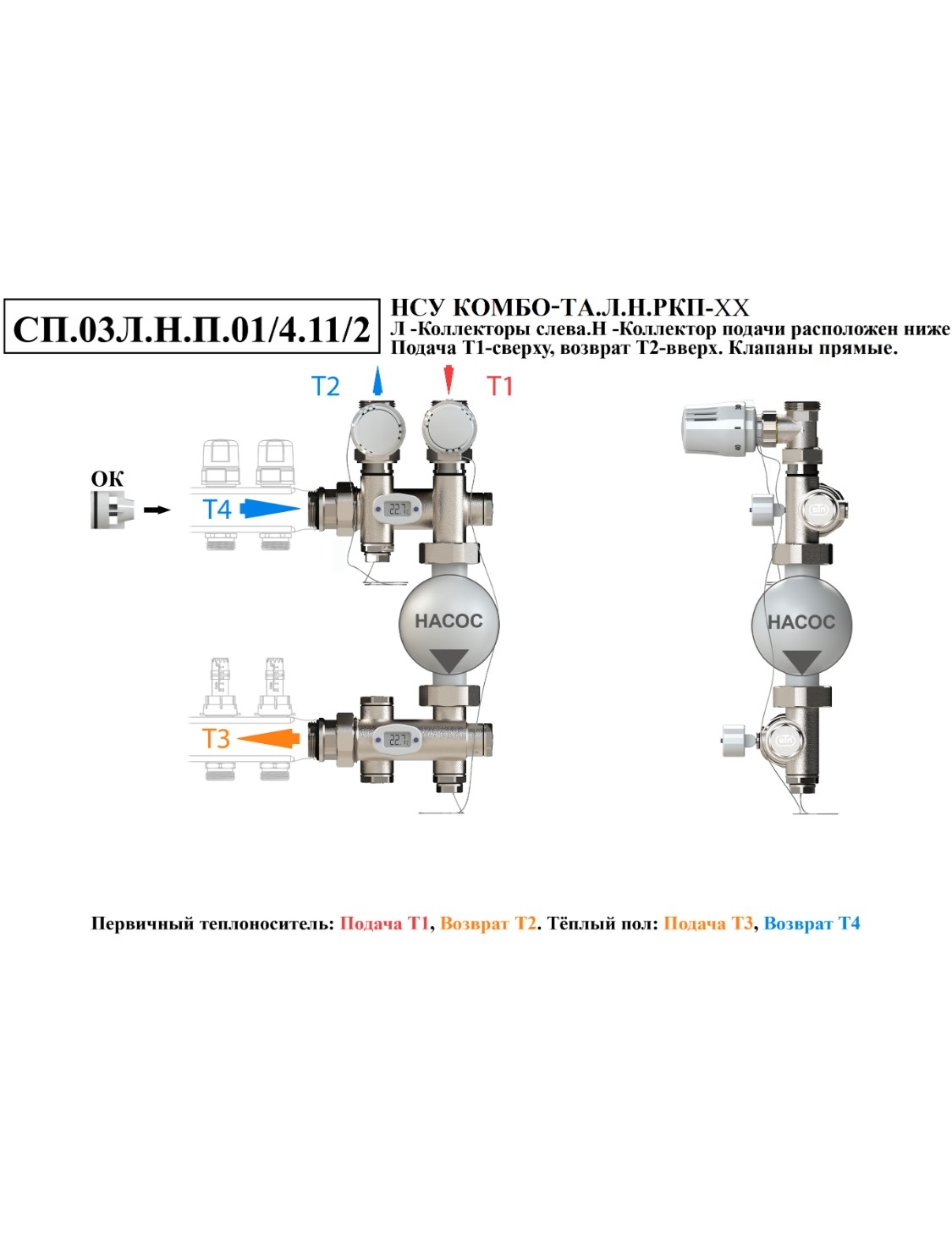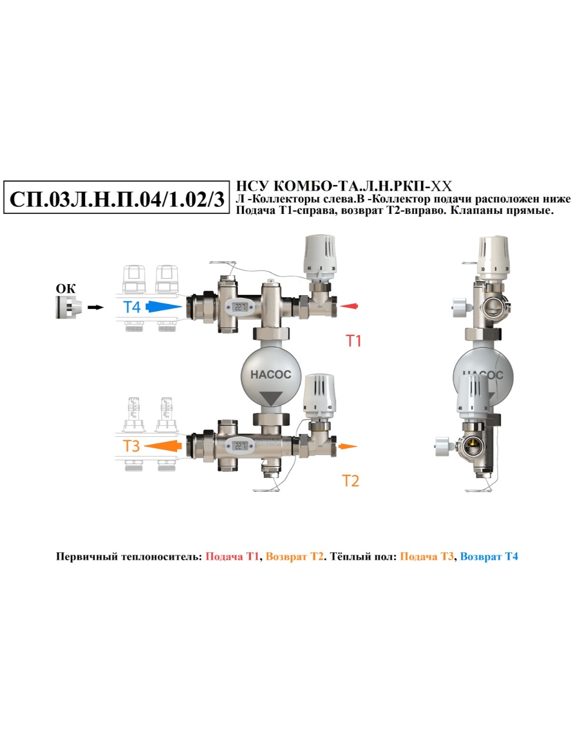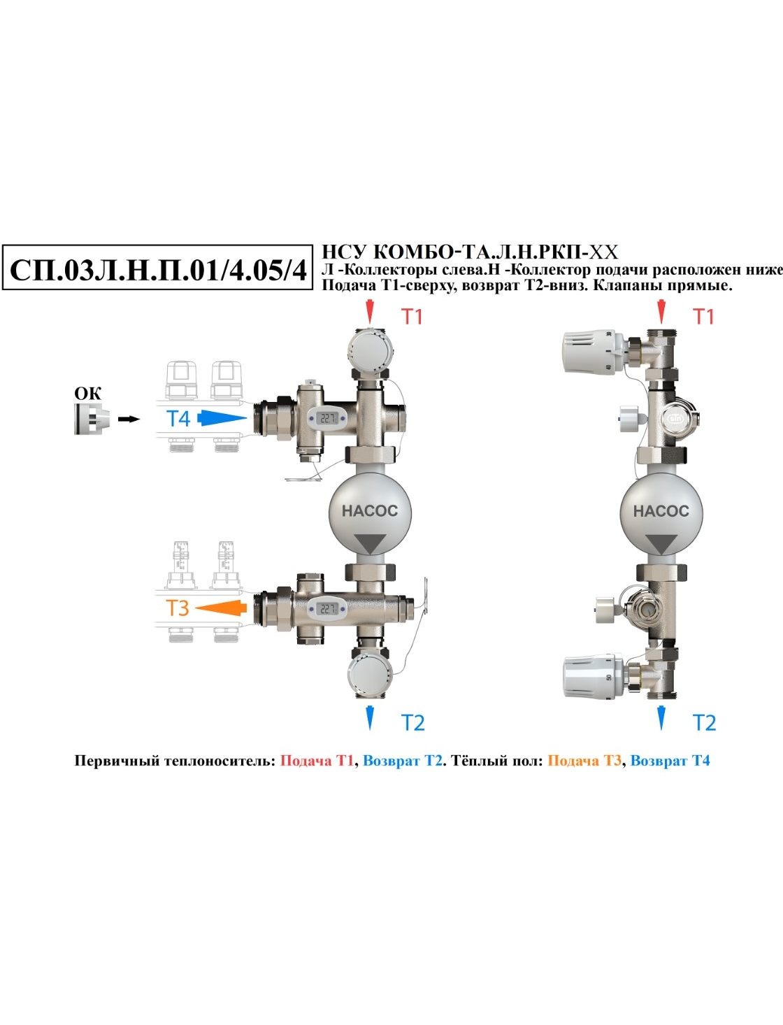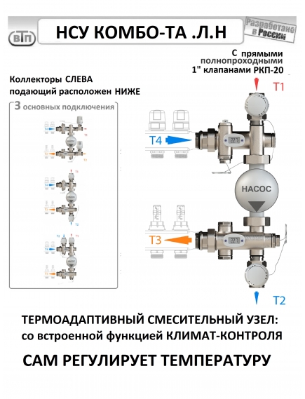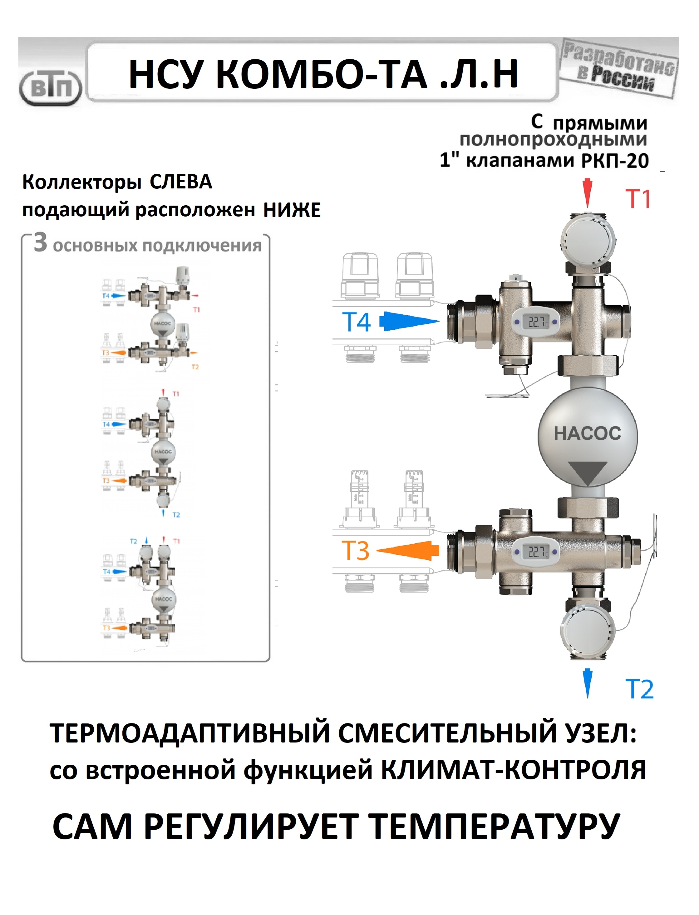 ТермоАдаптивный Насосно-Смесительный Узел КОМБО-ТА.Л, далее ТА НСУ КОМБО-ТА.Л, предназначен для подготовки низкотемпературного теплоносителя и обеспечения его циркуляции через контуры системы отопления «Тёплый пол». Адаптирован для сопряжения с коллекторной группой, располагаемой с левой стороны от узла. Позволяет реализовать нижнее подключение теплоснабжающей магистрали с параллельным типом смешивания теплоносителя, а так же боковое подключение - с последовательным.