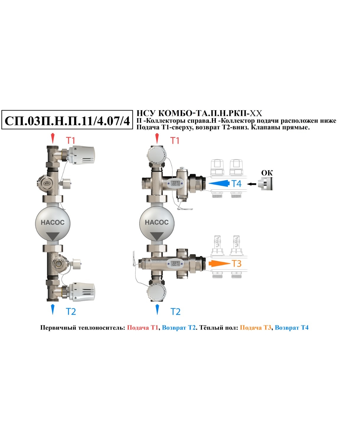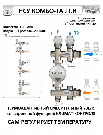 ТермоАдаптивный Насосно-Смесительный Узел КОМБО-ТА-П, далее НСУ КОМБО-ТА-П, предназначен для подготовки низкотемпературного теплоносителя и обеспечения его циркуляции через контуры системы отопления «Тёплый пол». Адаптирован для сопряжения с коллекторной группой, располагаемой с правой стороны от узла. Позволяет реализовать нижнее подключение теплоснабжающей магистрали с параллельным типом смешивания теплоносителя, а так же боковое подключение - с последовательным.