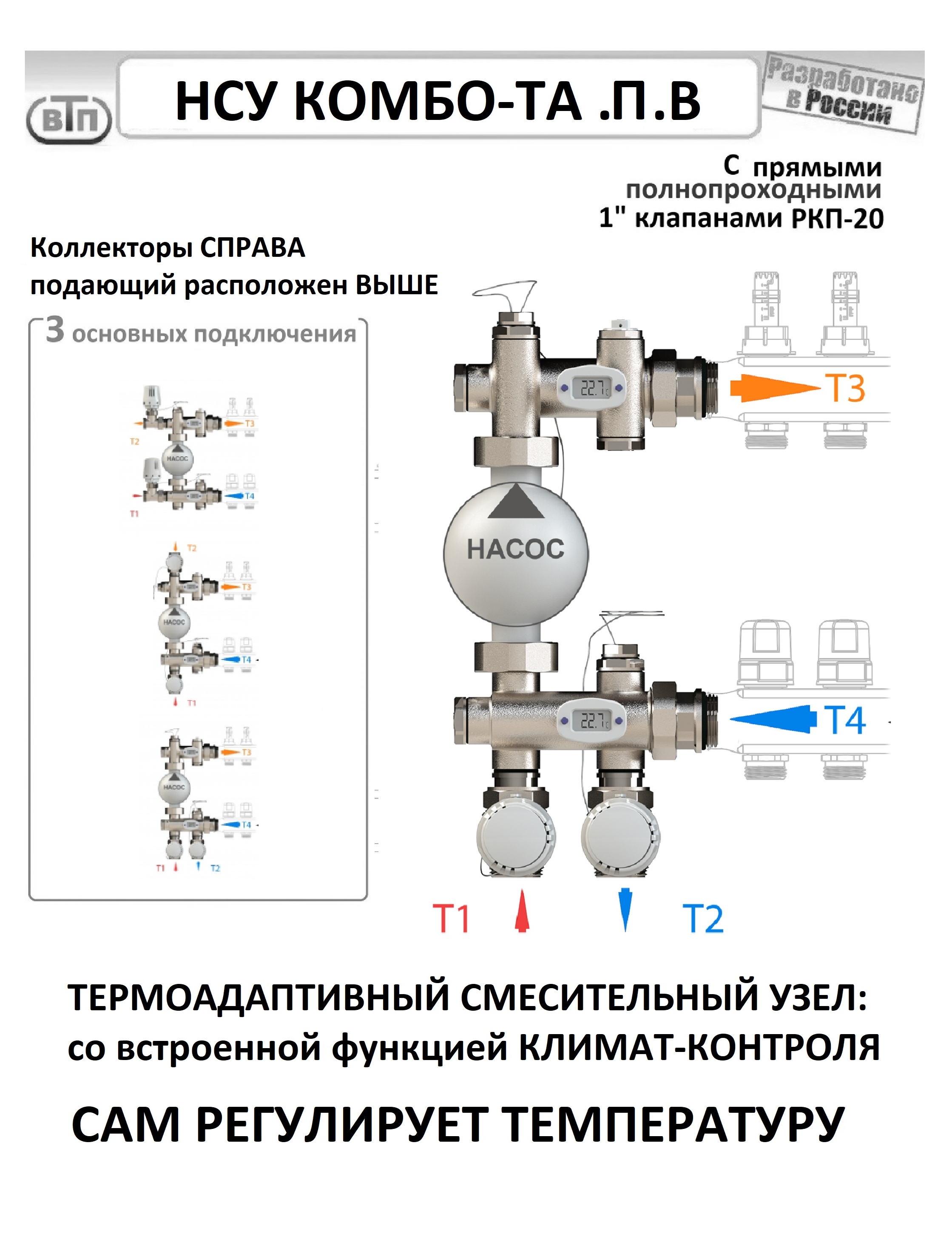 ТермоАдаптивный Насосно-Смесительный Узел КОМБО-ТА-П, далее НСУ КОМБО-ТА-П, предназначен для подготовки низкотемпературного теплоносителя и обеспечения его циркуляции через контуры системы отопления «Тёплый пол». Адаптирован для сопряжения с коллекторной группой, располагаемой с правой стороны от узла. Позволяет реализовать нижнее подключение теплоснабжающей магистрали с параллельным типом смешивания теплоносителя, а так же боковое подключение - с последовательным.