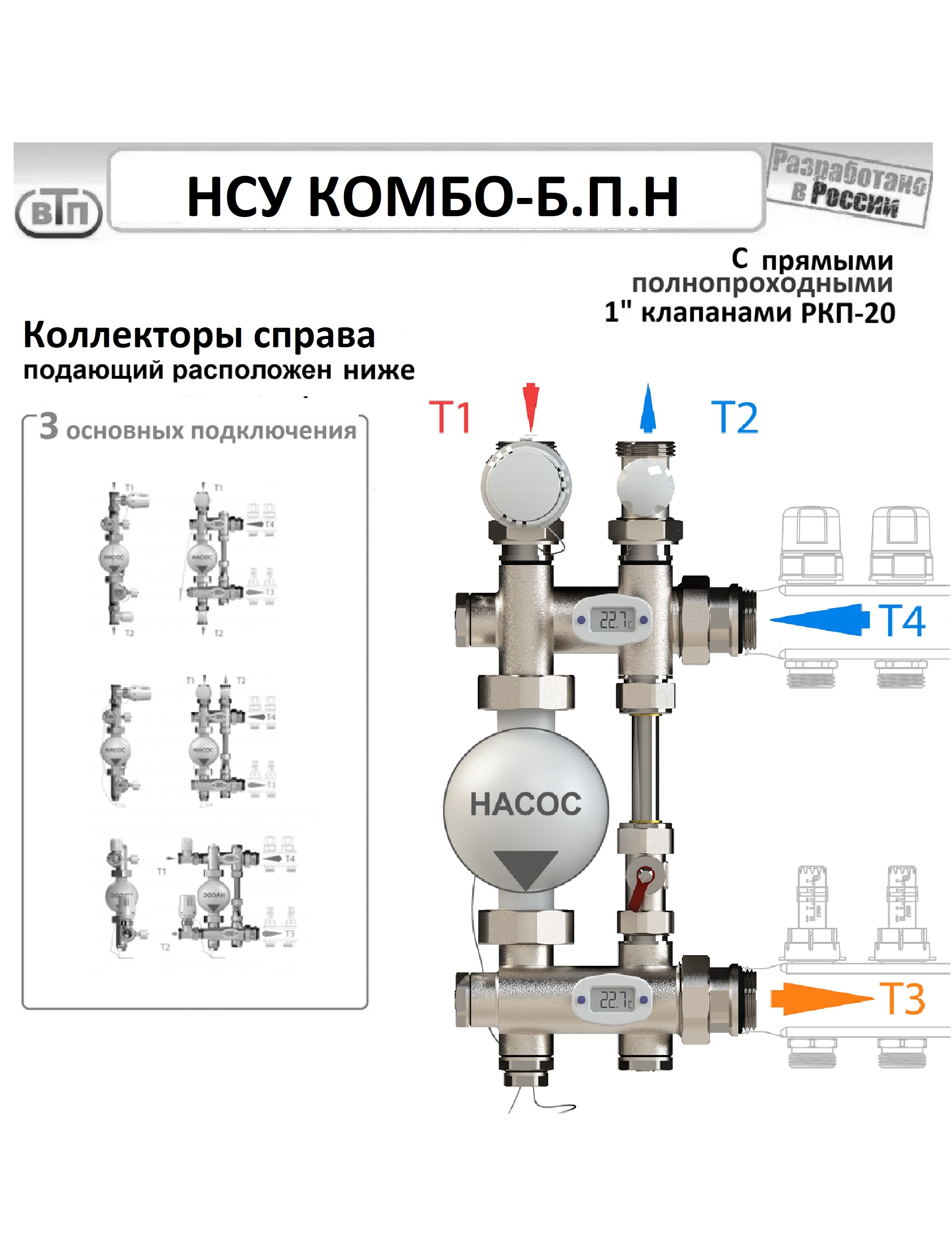 Насосно-смесительный узел НСУ КОМБО-Б.П.Н коллектор для теплого пола подключается справа, подающий нижний , с байпасом