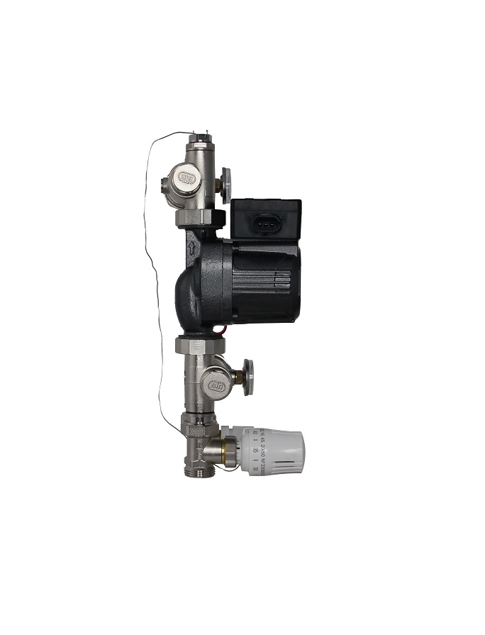НСУ КОМБО-Б позволяют управлять температурой в помещении с помощью комнатного термостата воздуха посредством периодического включения и выключения циркуляционного насоса. Теплоноситель, который поступает в контуры тёплого пола, будет ограничен до значения температуры, заданной на термоголовке, термодатчик которой размещён в блоке подачи.